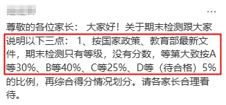 上周,长沙小学的期末成绩已经基本都公布了。按照以往情况,长沙望城区的小学期末考试只公布成绩等级,内五区以及长沙县大多数小学则会公布考试分数(不排名),但近期,有雨花区的家长反映小学期末也开始实行等级分数了: