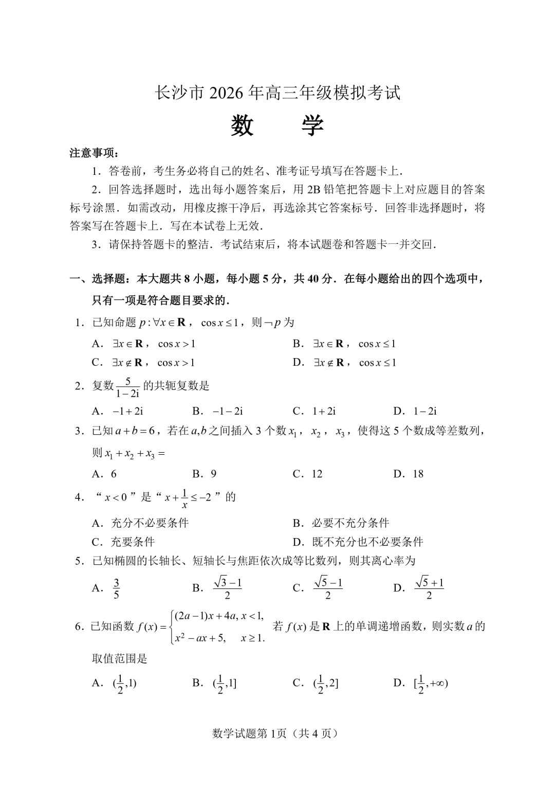 >湖南省长沙市2026届高三上学期模拟考试数学试题及答案