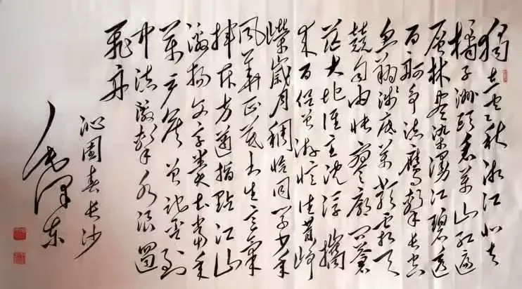 独立寒秋,湘江北去,橘子洲头。看万山红遍,层林尽染;漫江碧透,百舸争流。鹰击长空,鱼翔浅底,万类霜天竞自由。怅寥廓,问苍茫大地,谁主沉浮?