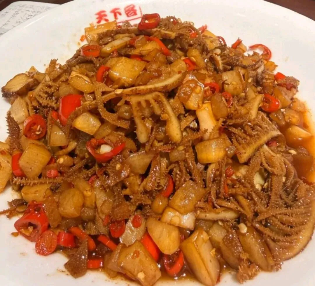 鱿鱼干与肉丝搭配巧妙,鲜辣开胃,鱿鱼干嚼劲十足。浸透油汤的鱿鱼丝更是香辣过瘾,将湘菜家常风味展现得淋漓尽致。