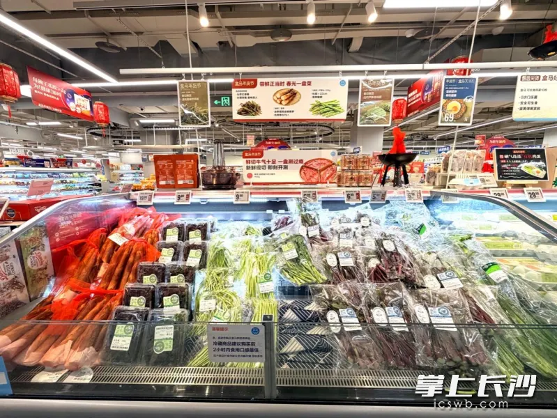 2月4日上午,长沙君在长沙盒马鲜生佳兆业广场店看到,芦蒿、荠菜、香椿等时令春菜已在蔬菜区整齐上架,与此同时,红菜薹、杭白菜和油麦菜等常驻嘉宾仍居醒目位置,新菜和年菜共同丰富市民的菜篮子。