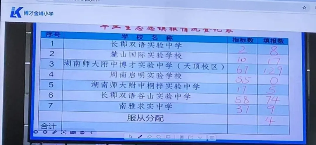 长郡双语谷山实验中学以58个指标、74人填报成为热门之选;湖南师大附中博才实验中学(天顶校区)10个指标吸引67人争抢,热度可见一斑;南雅求实中学、龙山国际实验学校等也有不少家长填报,最终 4 名学生选择服从分配。