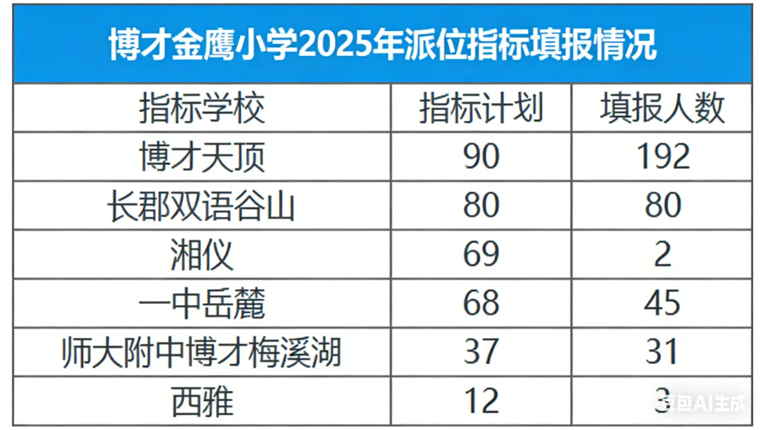 博才天顶校区堪称“人气王”,90个指标迎来192人填报,竞争尤为激烈;长郡双语谷山校区80个指标刚好报满,展现出稳定的家长认可度;一中岳麓、师大附中博才梅溪湖校区等也有不同程度的填报热度,而湘仪、西雅等学校填报人数相对较少。