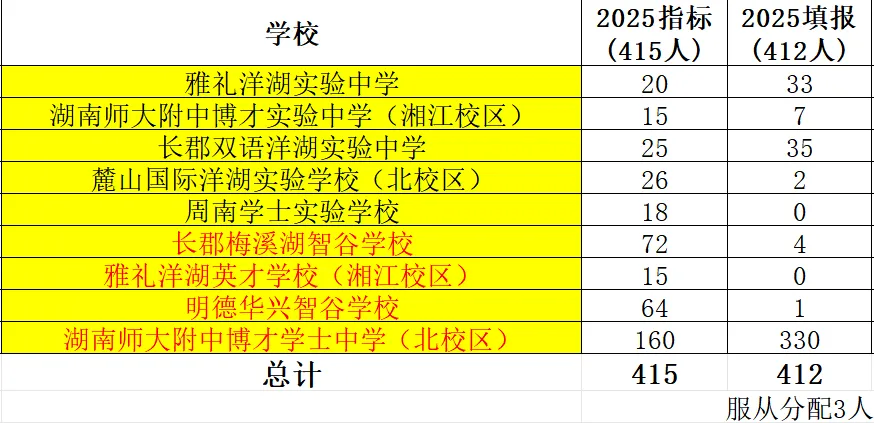 湖南师大附中博才学士中学(北校区)成为绝对热门,160个指标吸引330人填报;雅礼洋湖实验中学、长郡双语洋湖实验中学也备受青睐,分别有33人、35 人填报;部分学校如周南学士实验学校、雅礼洋湖英才学校(湘江校区)则出现零填报情况,最终3名学生选择服从分配。