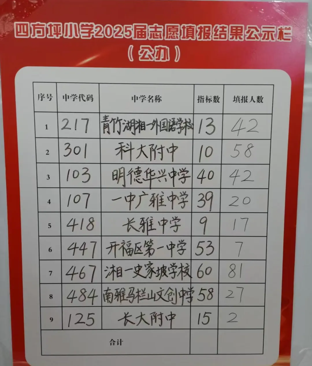 2025年仅有科大附中、湖大附中、雅礼中南附中天心校区三所子弟初中参与派位,指标计划有限但热度不均。以四方坪小学为例,科大附中派中率仅 17.24%;其余两所虽未收集到完整数据,但大概率也需通过派位才能入学。