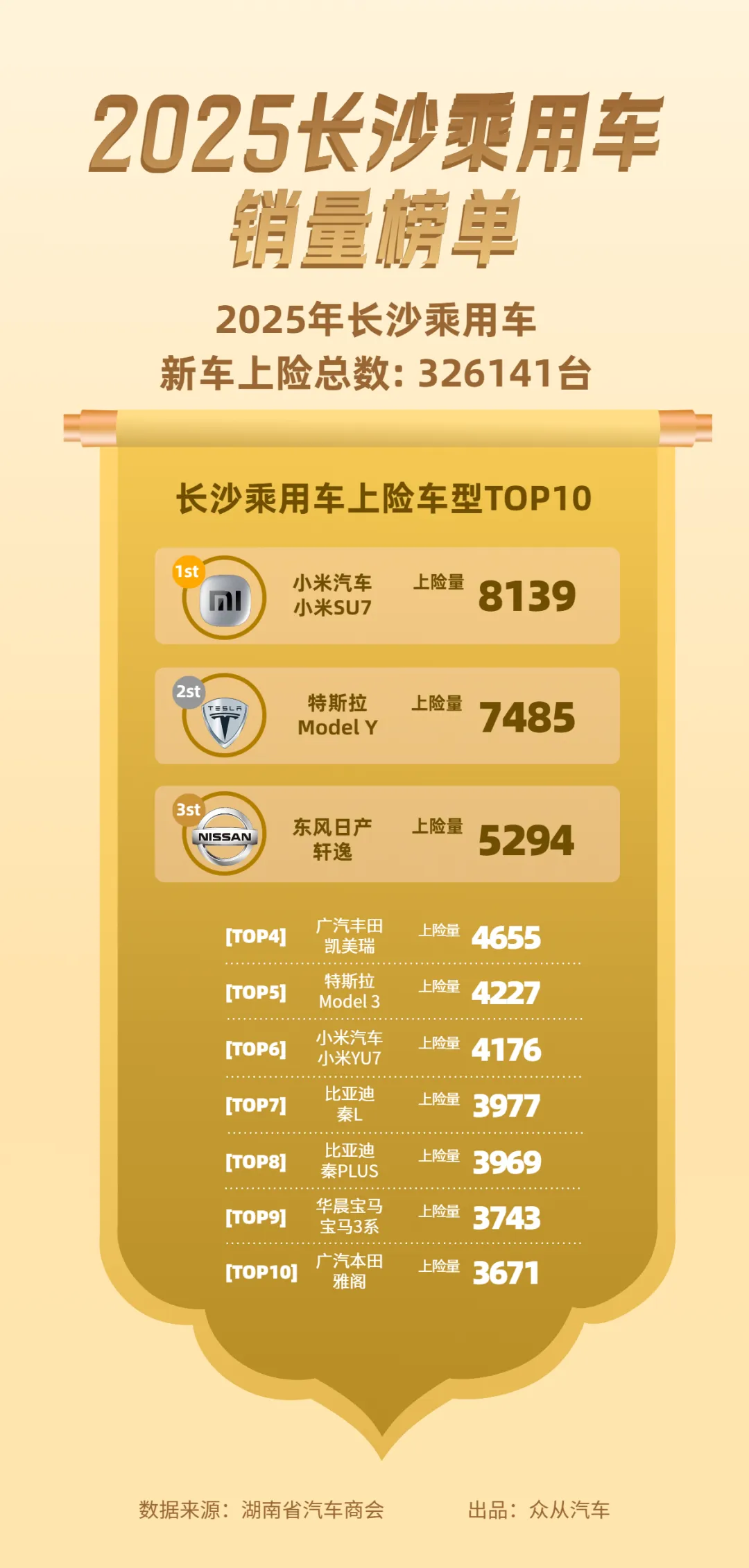 2025年长沙市乘用车年度销量榜单近日正式揭晓。数据显示,长沙全年新车上险总量达326,141台,市场竞争呈现新老品牌激烈交锋的格局。其中最为引人注目的是,小米汽车SU7以8,139台的年度销量强势登顶,成为长沙市场首款夺得年度销冠的新势力纯电车型,创下历史纪录。
