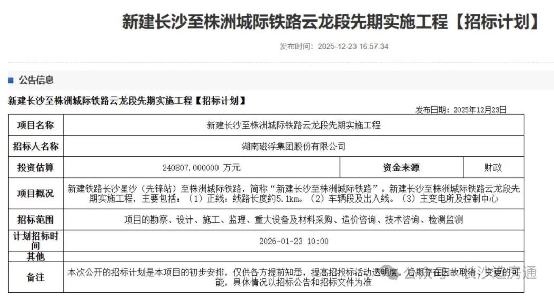 去年12月,湖南磁浮集团发布了《长株城际云龙段先期实施工程招标计划》。计划先期实施工程招标,建设云龙段起步工程5.1㎞,不过后来该招标取消。