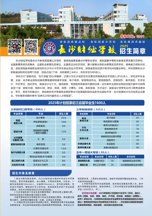 1.7 月 3日—7 月 5日,长沙城区应届初三毕业生可以来长沙财经学校进行专业咨询。 自愿①填写电子报名二维码(在招生简章最后位置,分城区报名登记和非城区报名登记)或②提交“长沙财经学校新生报名登记表 ”(此表可在长沙财经学校官网主页“招生专栏 ”中链接下载,请按填表说明填写),以上填写仅作录取提档时方便联系用。