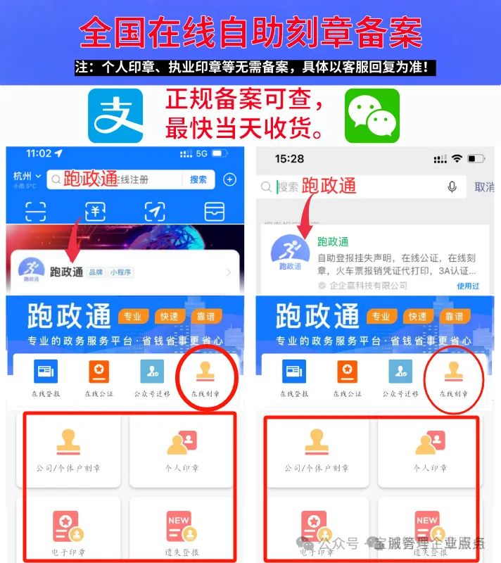 需跑遍工商局、公安局、刻章店,耗时2-3天,材料遗漏可能反复折腾。 - 线上办理: