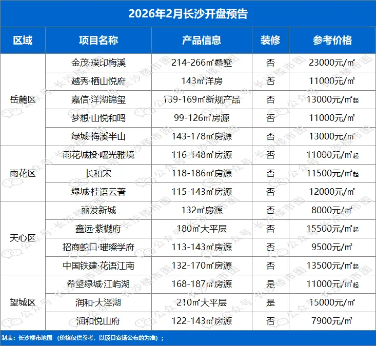 据不完全统计,2月长沙六区一县预计15个项目推新,均为老盘加推,无新盘入市!