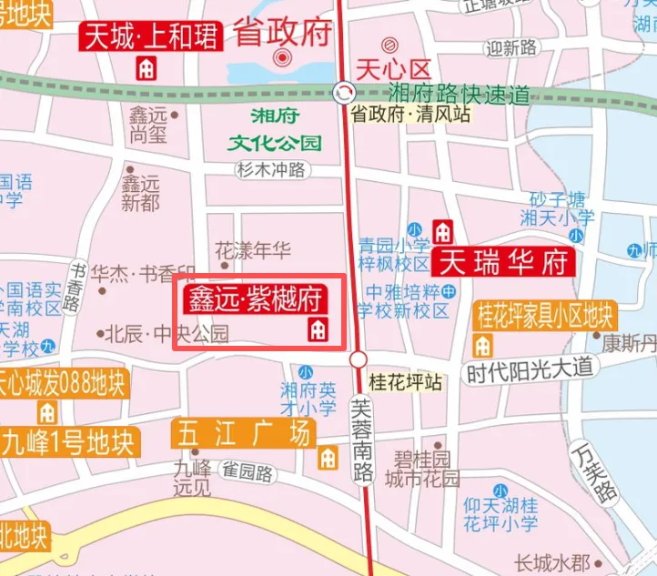 鑫远紫樾府离湖南省政府也就800米左右,妥妥的政务核心黄金地,还能享用到“三馆一中心”这些城市级文化配套,周边居住圈层也纯粹稳定。