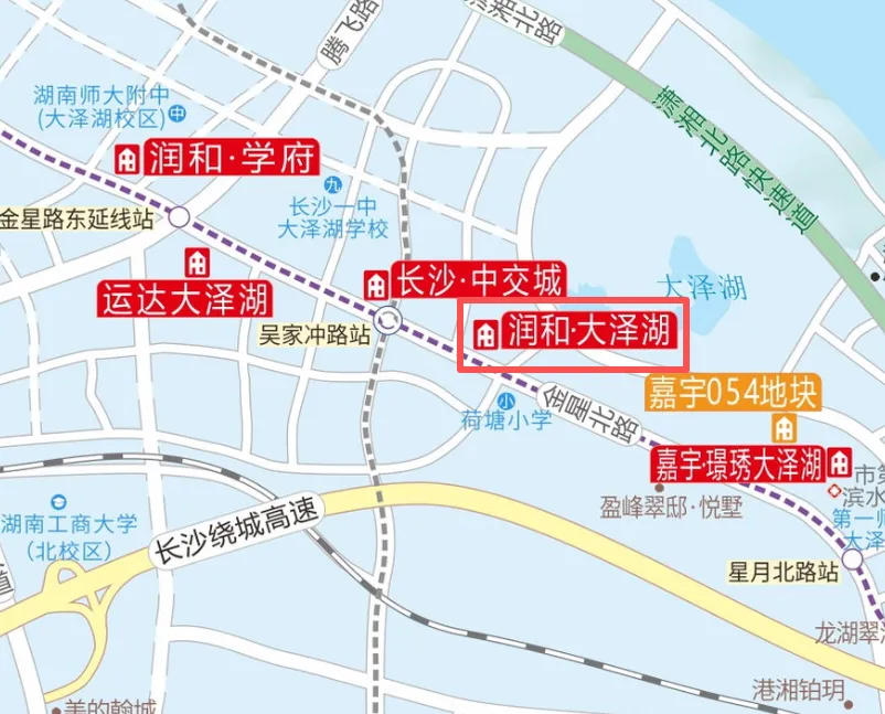 润和大泽湖出行方便,周边路网完善,在轨道交通上,距离地铁4号北延线吴家冲路站(在建)约400米,在远景规划中,地铁13号线与该站点换乘,可高效通达全城。