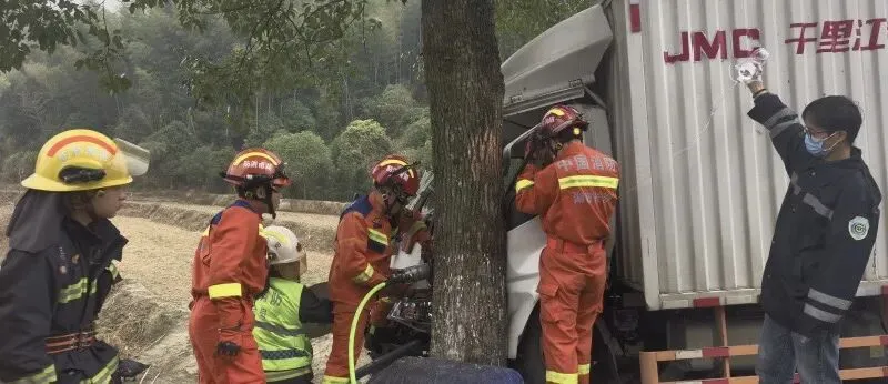 近日,浏阳张坊镇G354白石村路段附近突发一起意外事故,事发现场,一辆中型厢式货车因雨天路滑失控撞上路边上一颗大树,导致驾驶员脚部被卡,关口消防站接警后迅速赶赴现场。抵达现场后,救援人员使用扩张钳、顶杆等工具对变形驾驶室进行破拆扩张,经过约数十分钟救援作业,驾驶员被成功救出。来源:浏小阳