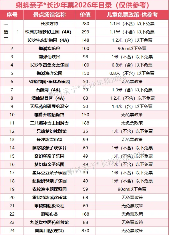 温馨提示:长沙方特、株洲方特、生态动物园为三选一场馆,3个任选1个游玩。如玩方特,需在2026.03.29前激活绑定年票。方特春节可用,2月8日前绑定,11日开始使用,3月29日前绑定,4月3日开始使用。
