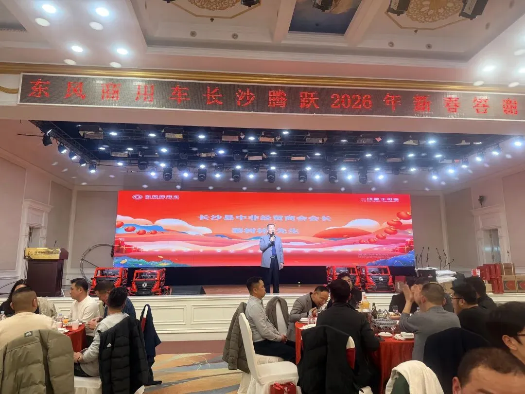 春和景明,宾朋云集。2026年2月6日,长沙县中非经贸商会副会长单位 —— 长沙腾跃汽车贸易有限公司主办的 2026 东风商用车新春答谢会盛大启幕。长沙县中非经贸商会会长黎树林、副会长陈富受邀参加,与各界合作伙伴齐聚一堂,以感恩之心共话过往成就,以前瞻之态共谋未来发展。