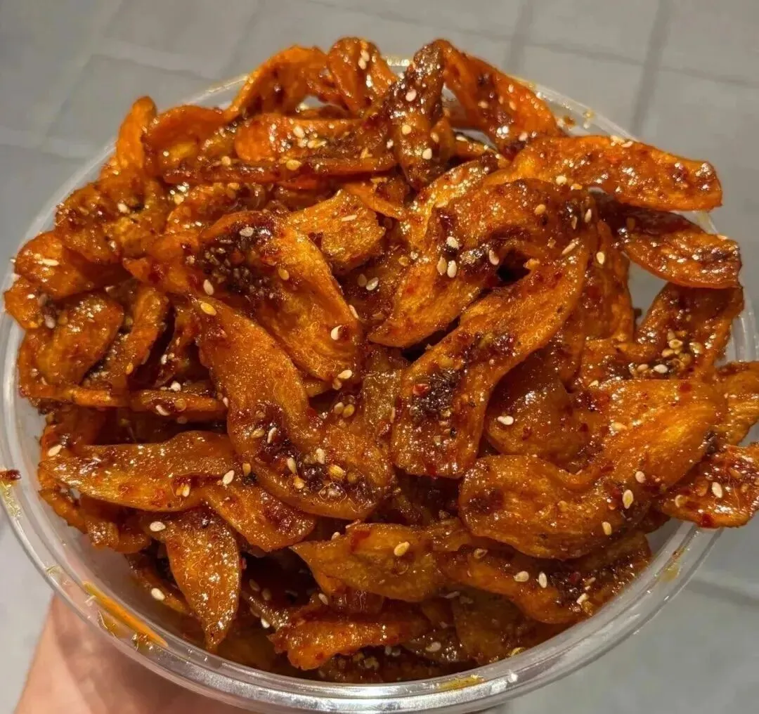 外面是有点酥的 , 但是咬进去里面又是那种梗啾梗啾的韧劲 , 口感层次特别丰富。 味道是麻辣的 , 但不是那种上头的辣 , 后面还跟着一丝丝甜 , 刚好把辣度给压住了 , 酱汁是真的渗透进去了 , 越嚼越香。