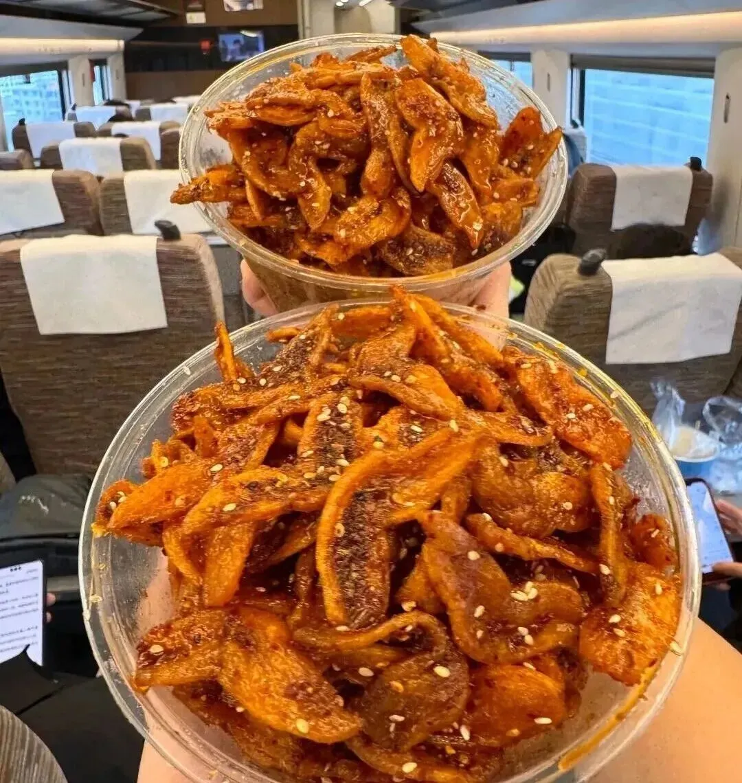 我坐在动车上 , 一口一个停不下来 , 等回过神的时候 , 一大包已经见底了。