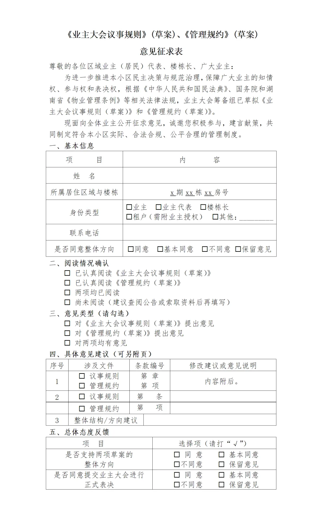 规则的完善,离不开每一位业主的参与和建言。接下来,恳请各位业主仔细阅读草案内容,若有任何意见、建议或修改想法,都请积极反馈给我们。我们会认真倾听、逐条梳理,让最终的《业主大会议事规则》更贴合小区实际、更符合全体业主的共同利益,携手共建更舒心的居住环境。