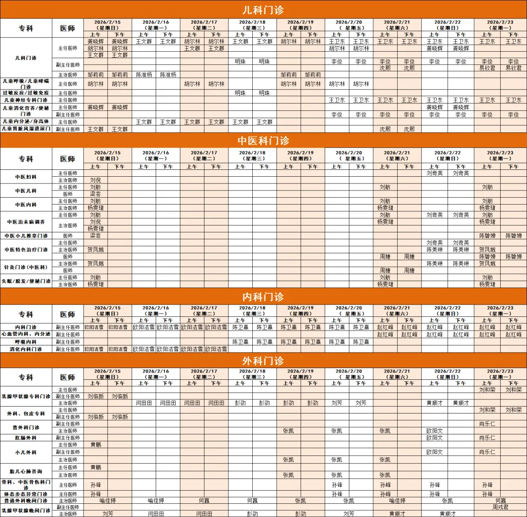 温馨提醒:节假日期间不开放午间门诊、夜间门诊。门诊“一站式”服务中心咨询电话:0731-84196850。24小时母乳喂养及咨询电话:0731-84136959。以下排班如有临时调整,以当日出诊信息为准,敬请谅解。请您根据实际情况,合理安排就诊。