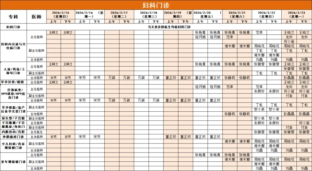 ① 产科门诊、妇科门诊、儿科门诊、内科门诊2月15日-23日正常开放。妇科宫腔镜2月15、16、20、21、23日上午开放;阴道镜手术2月15日-23日正常开放;人流手术2月15-16日、20-23日正常开放。产科糖耐量检测2月21、22、23日上午开放。盆底治疗室2月15、20日上午开放,21日-23日正常开放。