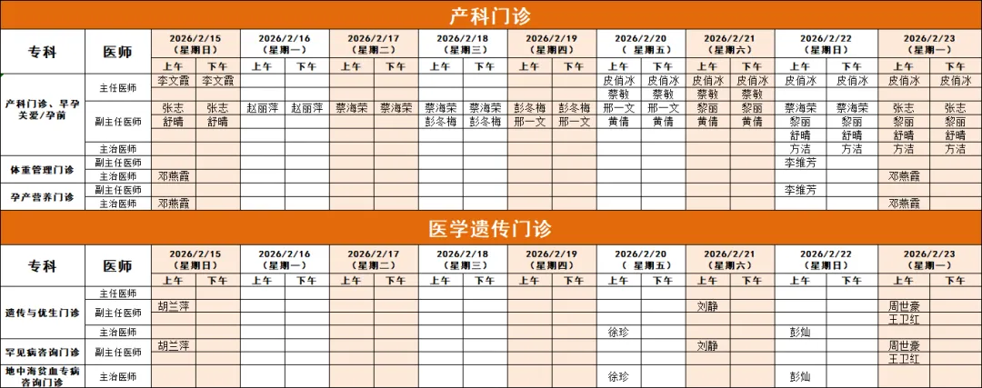⑤ 遗传与优生门诊、骨科门诊2月15日上午、20日-23日上午开放。