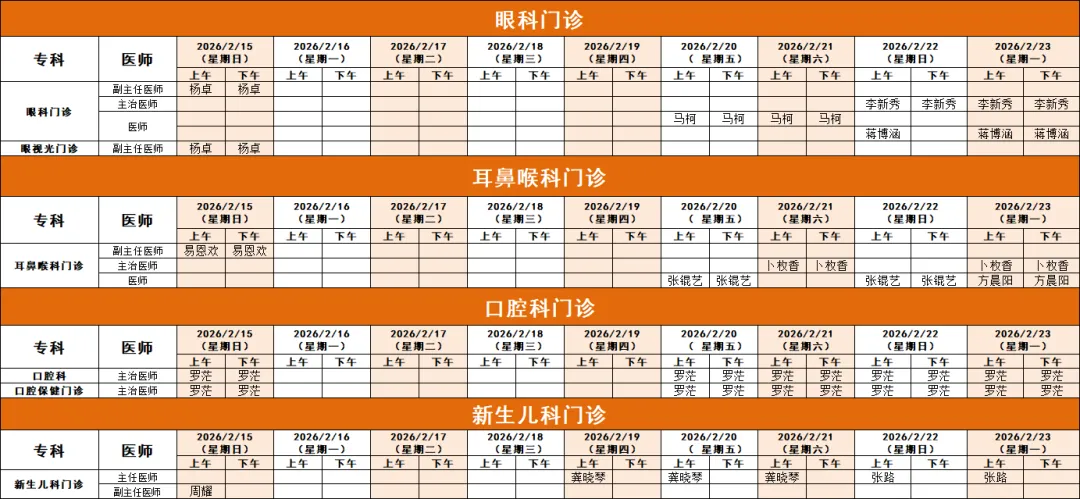 ③ 儿童保健中心门诊、眼科门诊、耳鼻喉科门诊(一号楼2楼)、口腔科门诊2月15日、20日-23日正常开放。