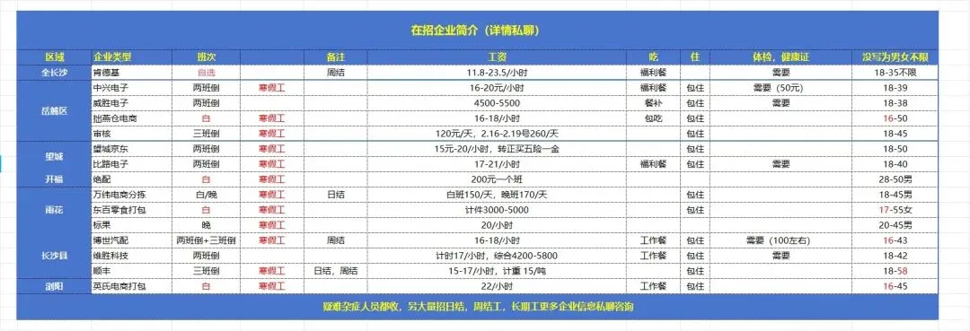 要求:有事做事,没事休息。做事认真麻利,打酱油的勿扰【装卸】上班时间9.30-21.30,190/天,多一小时多19,少一小时少19,20-48岁【打包】上班时间10点-22点,160/天,多一小时多16,少一小时少16,年龄18-50岁薪资结算:次日晚上结算,扣 3 元 / 天保险,吃饭休息不计工时报名方式:姓名 + 电话 + 身份证号 + 押金 报名工作要求:男生 年龄 20 岁以上 中途跑路都无工资!工作要求:男生 年龄 18 岁以上 女生 20 岁以上 摸鱼打酱油勿扰,中途跑路都无工资!工作要求:男生 年龄 20 岁以上 摸鱼打酱油勿扰,中途跑路都无工资!【待遇】160元不包吃(需要完成500单,没完成按0.32元/单核算工资,超过500单的部分有0.35元/单的提成,只要不摸鱼偷懒都能完成!!)🍄【21元每小时250元左右】招明天京东日结兼职100人晚班分拣20元/时,装卸21元/时(晚班额外有10元补贴)【待遇】18/小时,连做十天按20/小时,工期预计14号结束,可以提供住宿累了可以提前下班,赶不上可以晚点上班,每天出勤不低于10小时工资:只做一天190 元,女工工资 -10 元 保险3.5 元,能做到2月14号的每天➕30元,每周出勤6天年龄:男18—58岁,无案底,服从安排,中途跑路无工资(住宿押一天)包吃三餐,6:30直接到圆通签到,伙食好,做事轻松要求:男女比例7:3,男18-49.5岁,女18-44.5岁。提前下载好钉钉,方便上下班打卡,带好身份证年龄18-55周岁,男,身体健康,能适应快递装卸工作需要扣3块钱保险。10-30斤,有一定体力要求(从传送带搬到拖车上) 18:00 上班,当天做完下班,一般情况下 3-5 点做完。前两天按 150 一天结算, 做满 3 天的, 超过 3 点按 18 元/小时加班工资。🍄顺丰需要10个日结男女不限 稳定结账 轻松不累 工资两天结算一次 可以单做 可以连做 薪资:90💰/天 不包吃住 超过6小时算加班 加班18/h 早做完早下班工资不变 一般就是3~4个小时搞定 只做个三小时到4小时左右内容:食品打包 轻松不累 装到分拣筐里面 休息时间长要求:18以上 男女不限能稳定做事的人员 45以内 12个小时,涨工资320➕包吃➕大部分小件【招卸车兼职320元日结】【要求】招30人,25-55岁,男,能吃苦耐劳,服从安排,不能做事的不要来。【工资】卸车300,卸车连续5天不休息奖励100。包吃二餐,不扣保险费,不扣任何费用,加班20一个小时。提示⏰不要穿带帽子连体衣,过来上班,19:20签到⏰工作时间:19:00-6:30左右,有加班要加班。1️⃣招大元仓今天,明天晚班日结兼职180人,男女不限,每天都要。 晚班:16:00-05:00/,分拣工资230➕10连做补贴,装卸270➕10连做补贴‼️⚠️注意(连做补贴必须连续做三天才有),包吃两餐温馨提示:有地铁6号线直达,有公交直达,交通方便。2️⃣招长沙县福中路榔梨极兔晚班日结兼职50名(每天都要,随时报名。晚班18:30-6:30,分拣210➕10连做补贴,卸车工资250➕10连做补贴⚠️注意‼️(连做补贴必须连续做三天才有)包一餐。有无身份证都可以。要求:服从安排,最好不要穿连帽外套。2月份: 17元/时➕2元/时补贴(做到2月15号才有补贴)【薪资待遇】120/天,包住,白班夜班可自由选择。地址:松雅湖天虹君尚,过年三天,每天加班补贴120元【要求】18-45岁,女生,能接受加班,有时候会加班到晚上10点,视力好,无色弱,接受站班18元/时,寒假工做到2月13号左右放假,年前结清工资 岗位:空调车间,生产手机盖板边框生产制作,自由不累,男生CNC开机两班倒要求:男工18-45岁,无需经验,不用体检当天安排宿舍住宿环境:住宿就厂旁边板桥公租房,包住宿4-6人间水电费平摊,有食堂要求:男18~45岁,女18~42岁,不用体检当天安排宿舍【工资待遇】日常工资16元/小时,2月16日—3月3日这16天工资按18元/小时,除夕到初三额外补贴50元/天过年补贴【注意】必须要出勤做到3月3日,每周可排休一天,过年期间要出勤【工作内容】以观沙岭街道办为准,各部门和员工协同管理和规划,进行观沙岭全域进放烟花行动,以劝阻为主不能强制收取,避免和群众发生冲突。【工作人员】内部人员➕辅助人员共200名由队长带守➕各站点人均30-50左右①18-52,男女不限(男生52以下,女生45以下!男生为主,女生占比15%)②男生身高165及以上,女生158及以上,需出勤4天,自备黑色裤➕鞋子🍄长沙各区奶茶店打烊保洁 长期兼职 过年期间双倍工资。工作内容:每晚11点后店里关门来搞清洁卫生,工作比较简单但要求认真细致。工资:三家小店:2000元,大店3000元(基本工资2400元+培训补贴600元,工作时带新人帮你做保洁)每天3-5小时左右完成,熟练后会很快。工作自由轻松,但每晚都要来上班(特殊情况自己提前找同事替班)年龄:28-55岁,男女不限,女性优先,住在附近的长期稳定的。⚠️门店:司门口3家,海信广场3家,黄兴步行街7家,长郡中学2家,国金中学4家,新大新3家,友阿百货人民路3家,阜埠河地铁站5家,吉联mall3家,五一公交站3家,协信星光PARK3家,谢子龙艺术馆3家,粉巢4家,蝴蝶大厦2家,高铁站8家,高铁吾悦4家,杉杉奥特莱斯2家薪资待遇: 17元时➕2元/时稳岗奖励,做到2月15号才有,工资周结,人走账清❤短期周结工:17元/时,一周内结清80%,剩下的20%次月15号发放❤长期工:20元/时=17+3元工时奖励(当月工时满270)每周可预支,每月15号发薪,择优转正购买五险一金要求:男女不限18-38.5岁,无案底,无明显纹身,接受两班倒岗位:主要负责机顶盒和路由器的检测、抽检、组装、包装,工作简单轻松,空调车间,普通工衣,坐班为主公司福利:提供住宿,空调,热水器,洗衣机,独立卫生间等🍄仓