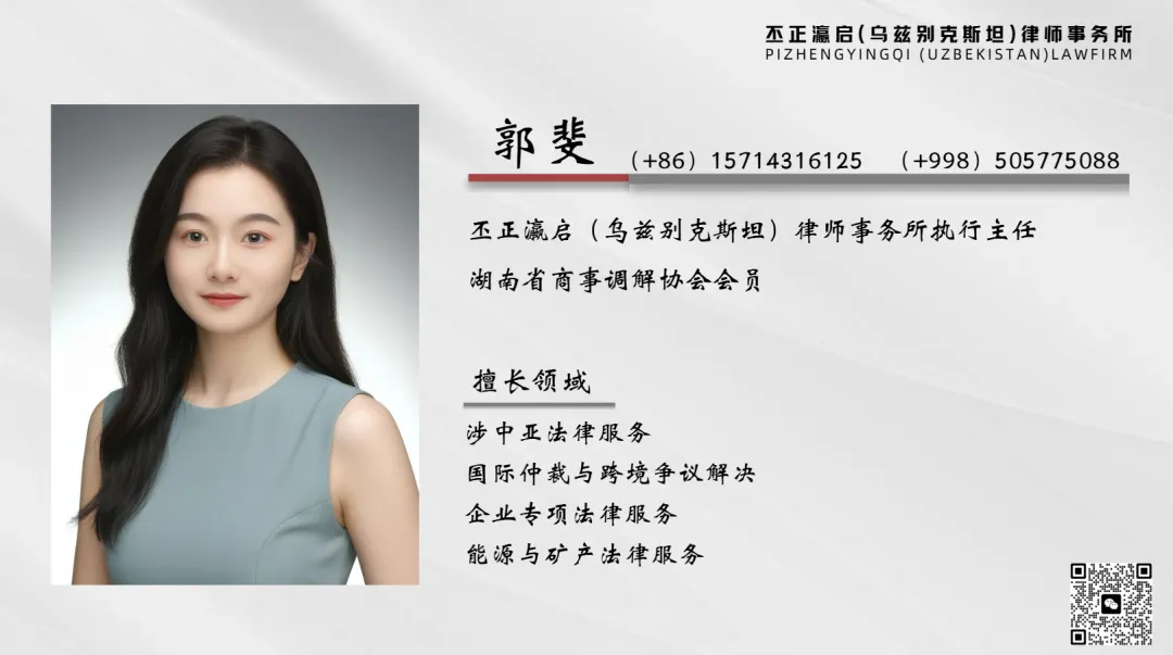 丕正瀛启(乌兹别克斯坦)律师事务所,是湖南丕正律师事务所联合湖南瀛启律师事务所在乌兹别克斯坦共和国塔什干市成立的、一家以“中国背景、本土服务、党建引领”为特色的综合性法律服务机构。依托两家湖南本土律所在涉外法律服务领域的专业优势,团队成员能以中文、俄语、乌兹别克语、英语等语言,为双边政府机构、企业及公民提供跨境投资、国际贸易、争议解决等全领域法律服务。