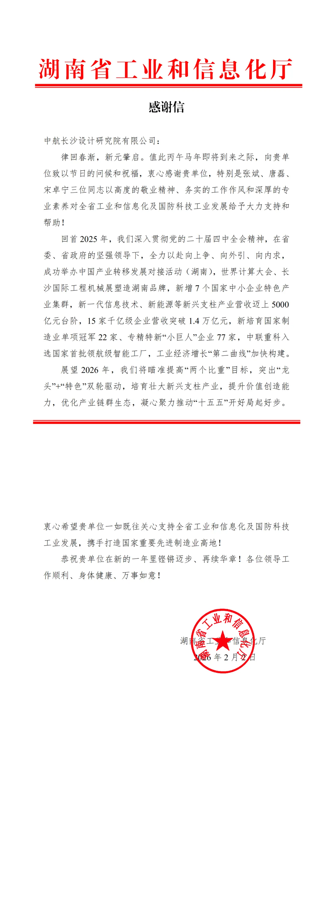 近日,公司收到湖南省工业和信息化厅(以下简称省工信厅)发来的感谢信。信中对长沙院展现出的“高度的敬业精神、务实的工作作风和深厚的专业素养”予以充分肯定,对长沙院多年来为全省工业和信息化及国防科技工业发展提供的智库支撑和优质技术服务表示衷心感谢。