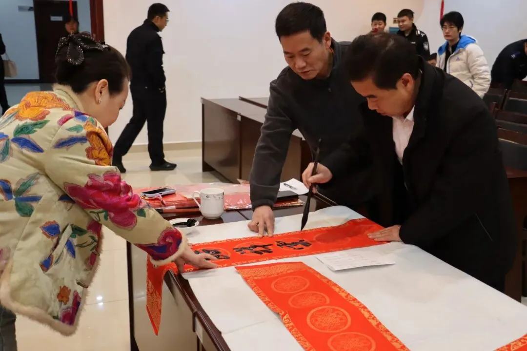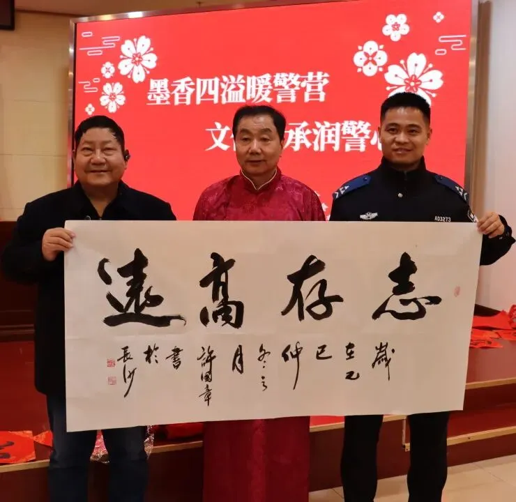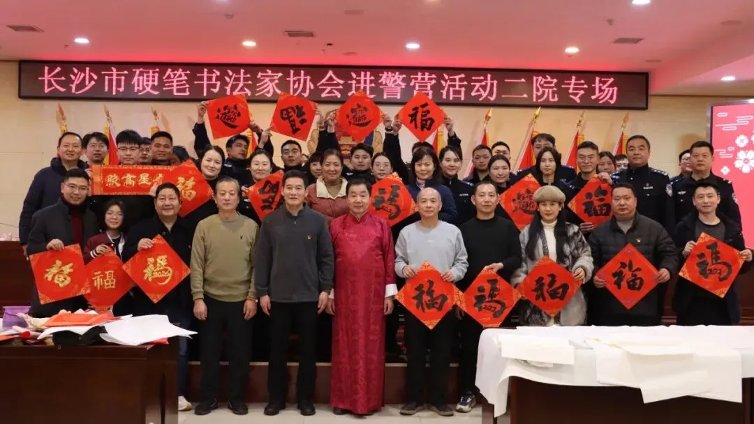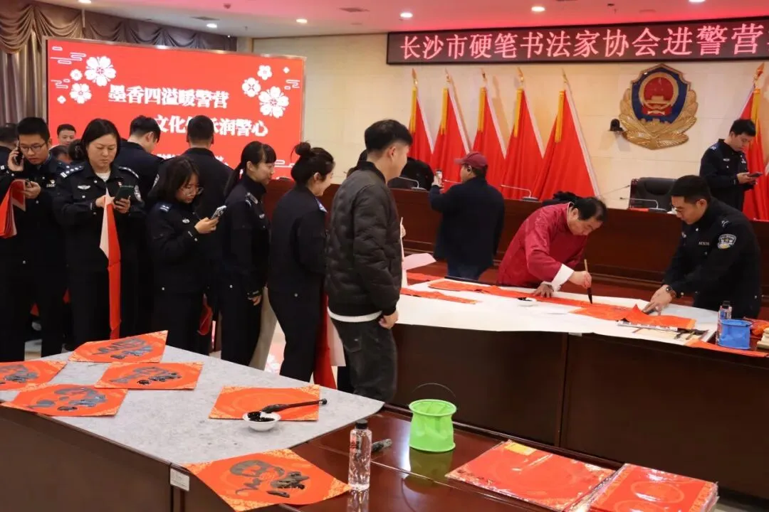 为进一步落实从优待警、文化育警举措,营造浓厚的新春节日氛围。根据市公安局、市警察协会统一安排,2月5日,长沙市警察协会联合市局工会、公交(轨道)分协会及市硬笔书法家协会,在市局机关二院举办“墨香四溢暖警营 文化传承润警心”文化进警营专场活动。国家一级书法家许国章、龙宏毅,以及骆正义、吴明亮、周飞、李曙曦等9位书法名家现场挥毫泼墨,为民辅警送上新春祝福。警察协会秘书长王海清全程组织协调,公交(轨道)分局政委段迎新、内保支队政委李云帝、森林公安局政委李超、市局工会副主席余建武等领导出席活动,与民辅警共同感受传统文化魅力。