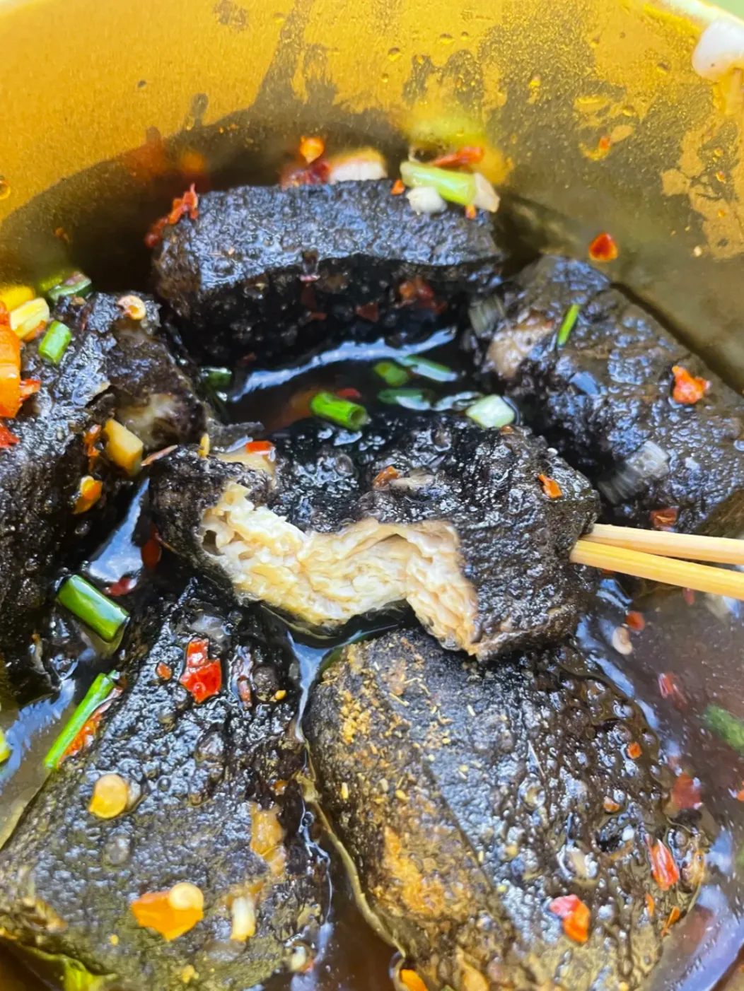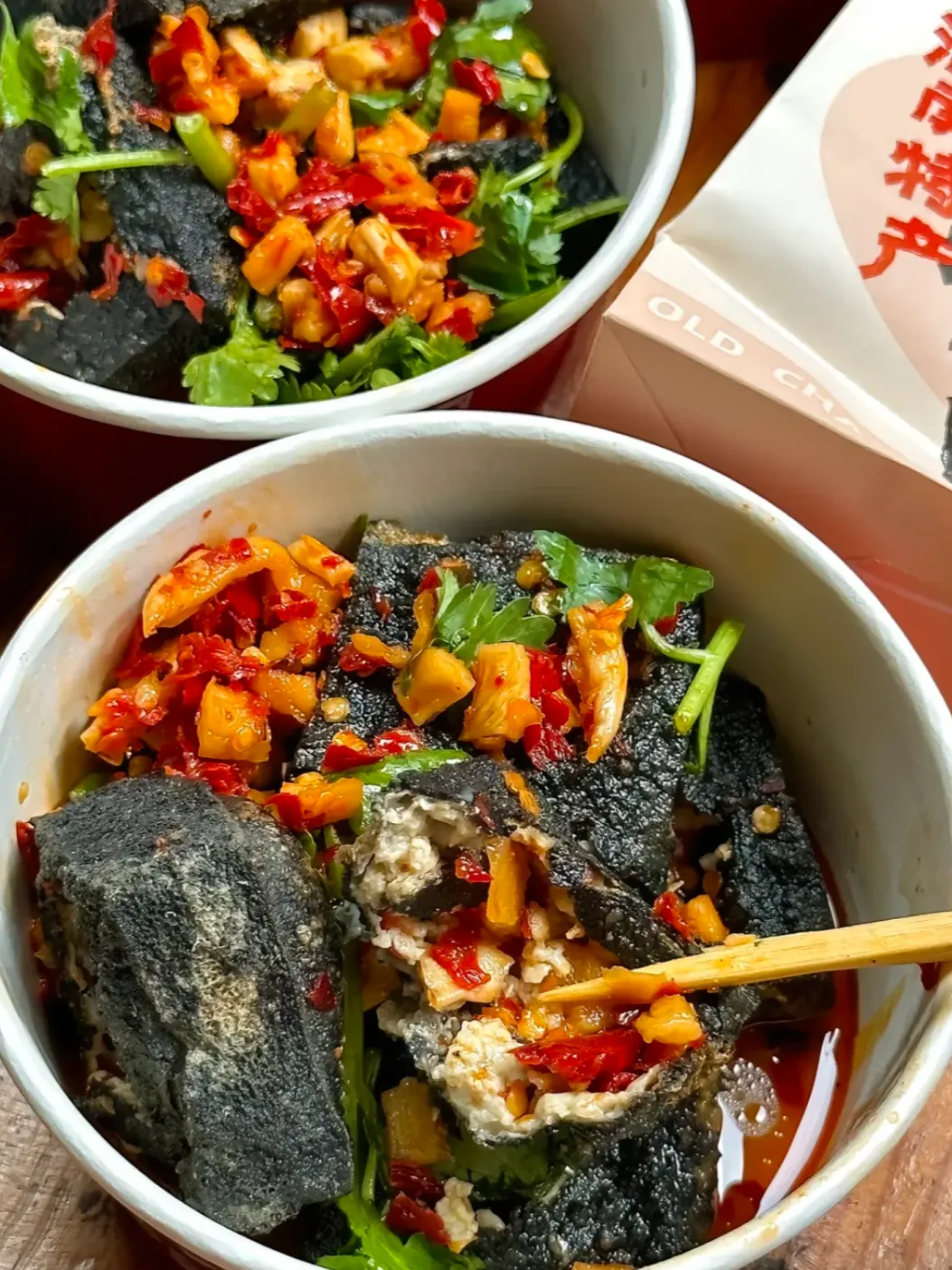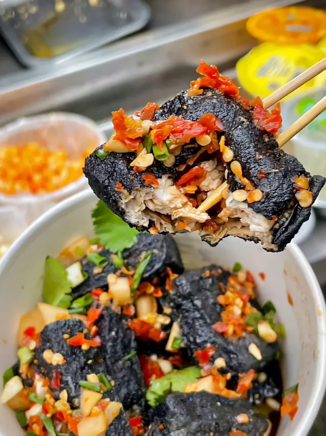 黑色外皮经油炸后焦脆酥香,搭配辣椒、蒜蓉等调料,入口爆汁,咸香热辣。