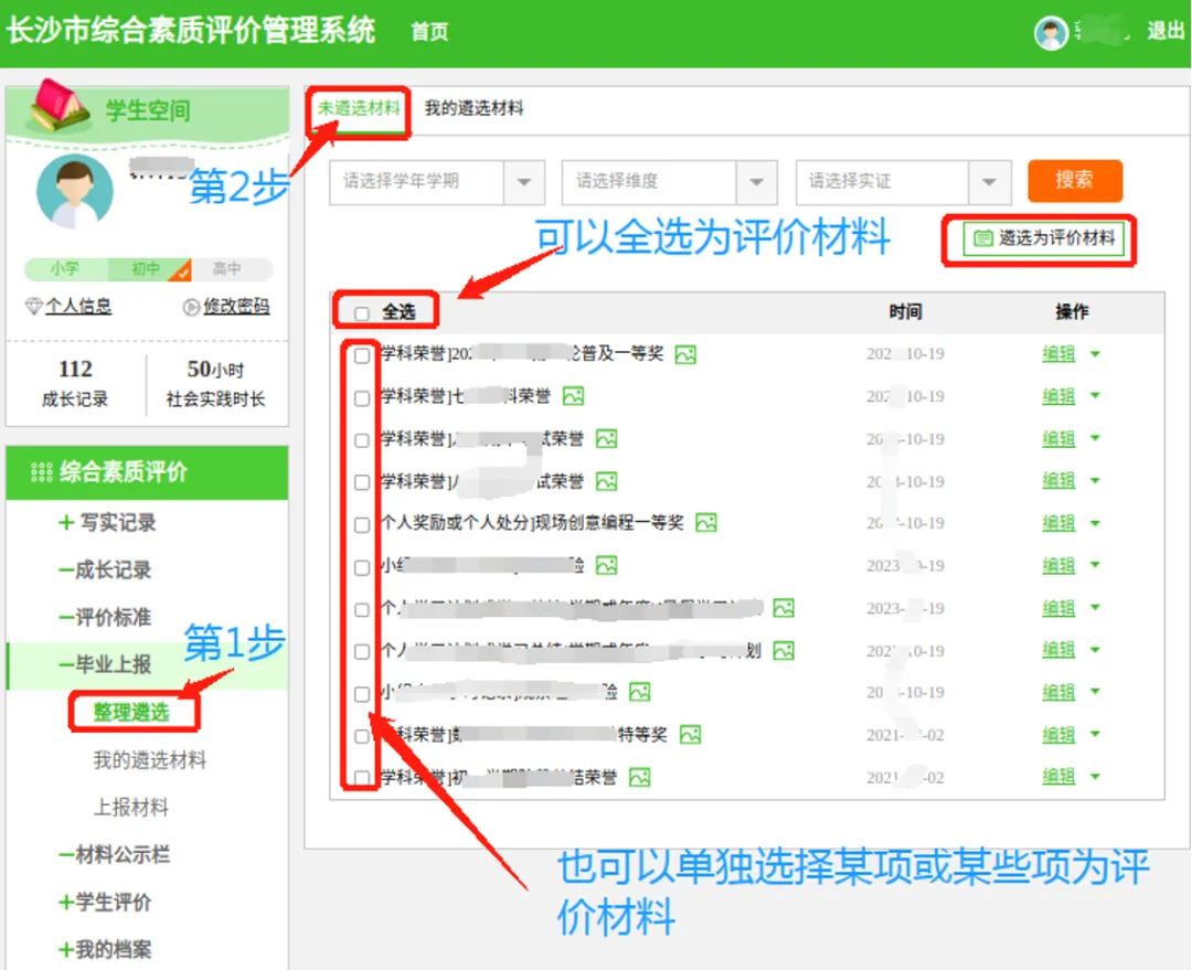 长沙市综合素质评价管理系统 | 绿色页面 | 遴选、上报综评材料,还有互评、老师评价 | 重点操作!材料必须在这里 “上报” 才有效 |