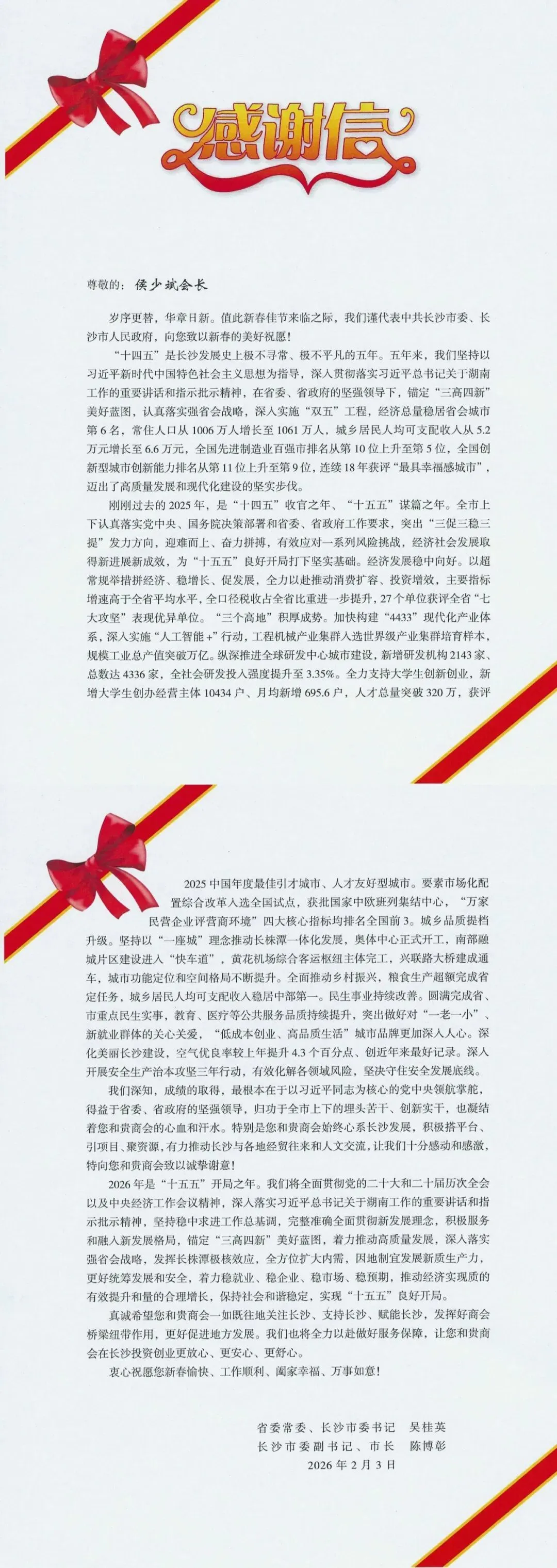 新春之际,湖南省广东商会收到中共长沙市委、长沙市人民政府发来的感谢信。来信对侯少斌会长及湖南省广东商会为长沙高质量发展作出的重要贡献表示感谢,并向侯少斌会长致以新春问候和美好祝愿。