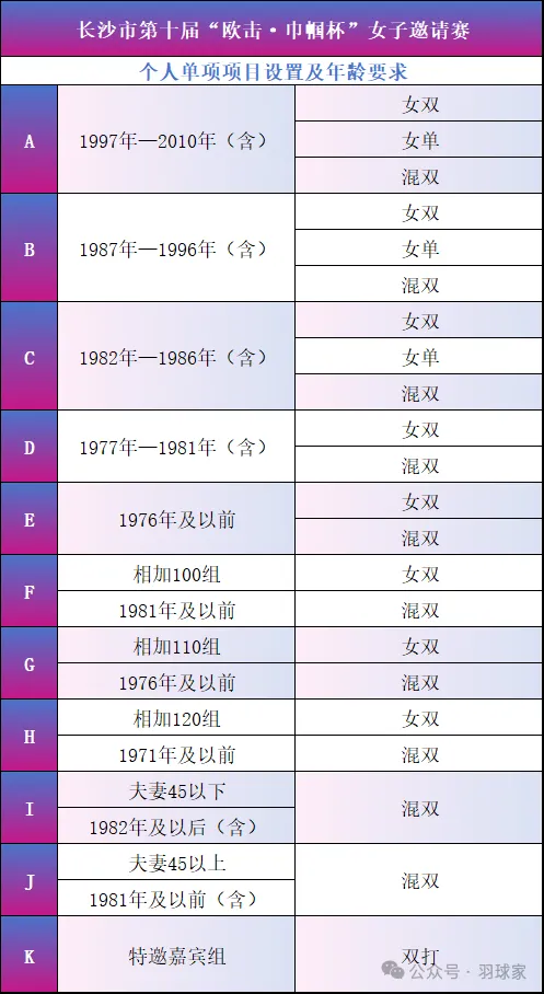 1、报名渠道:关注微信公众号 “长沙市羽毛球协会”,点击 “赛事报名→赛事→2026 长沙市第十届‘巾帼杯’女子羽毛球赛” 报名;