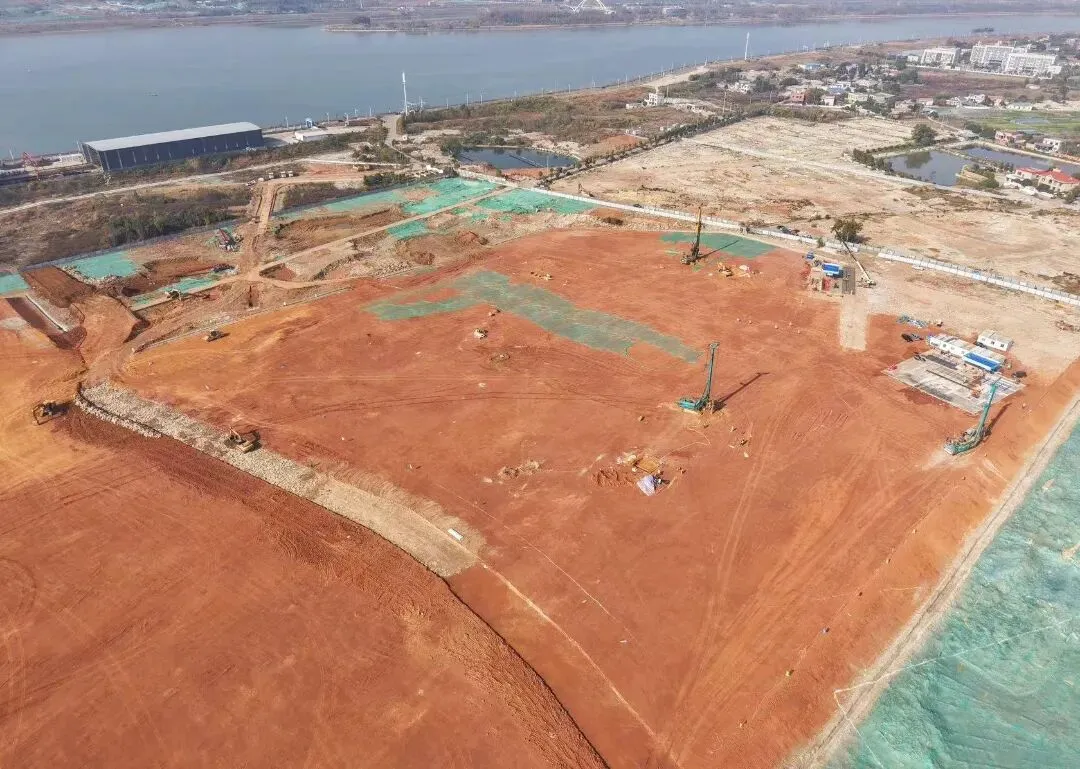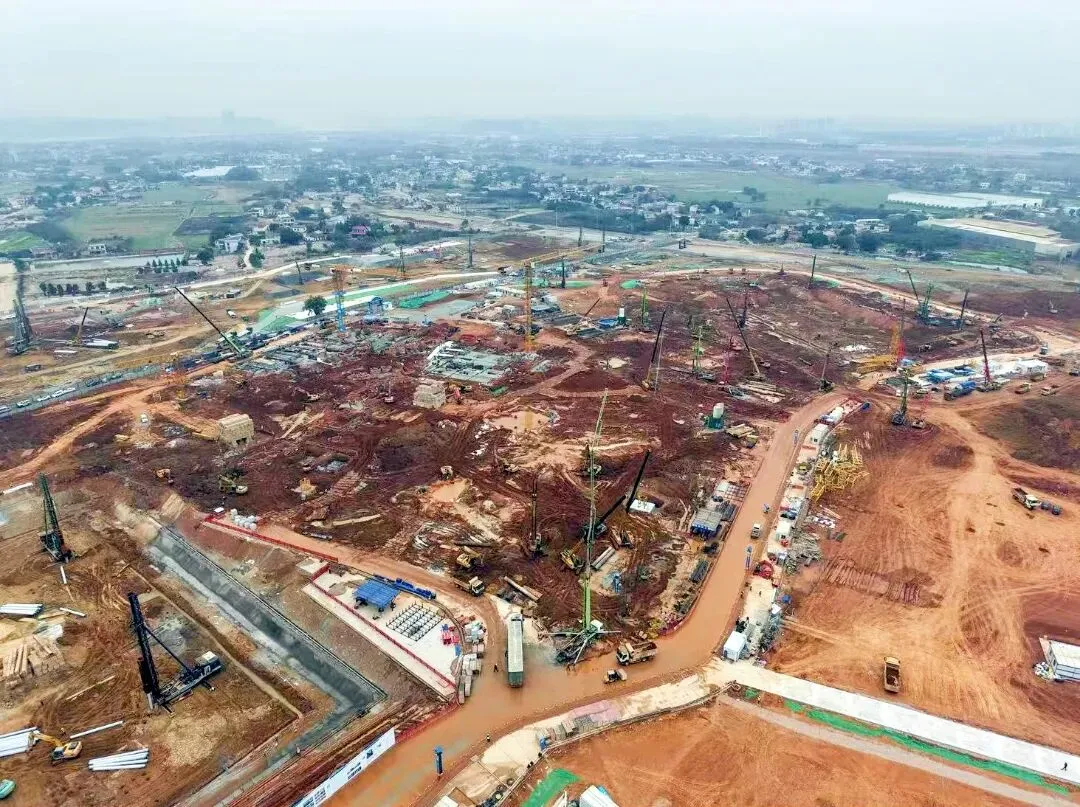 项目所处地质条件复杂,地下圆砾层较厚、地下水丰富,给桩基成孔质量带来严峻挑战。面对成孔稳定性控制难、场地狭小导致多台大型旋挖钻机协同作业受限,以及长沙冬季低温雨雪等多重困难,在长沙城发集团的统筹指导下,各参建单位统一思想、协同作战,秉持“品质为核、创新为翼、效率为先”的理念,制定了“挂图作战、昼夜轮班、技术攻坚”三位一体的推进方案。经专家论证,创新采用“钢护筒+泥浆护壁”工艺,有效防止塌孔,在提升成桩效率的同时保障了成桩质量,并实现了材料的节约。此外,通过BIM数字化技术精准规划桩位布局,运用高精度全站仪进行桩心毫米级定位,确保千余根桩基的垂直度与承载力均满足设计标准。