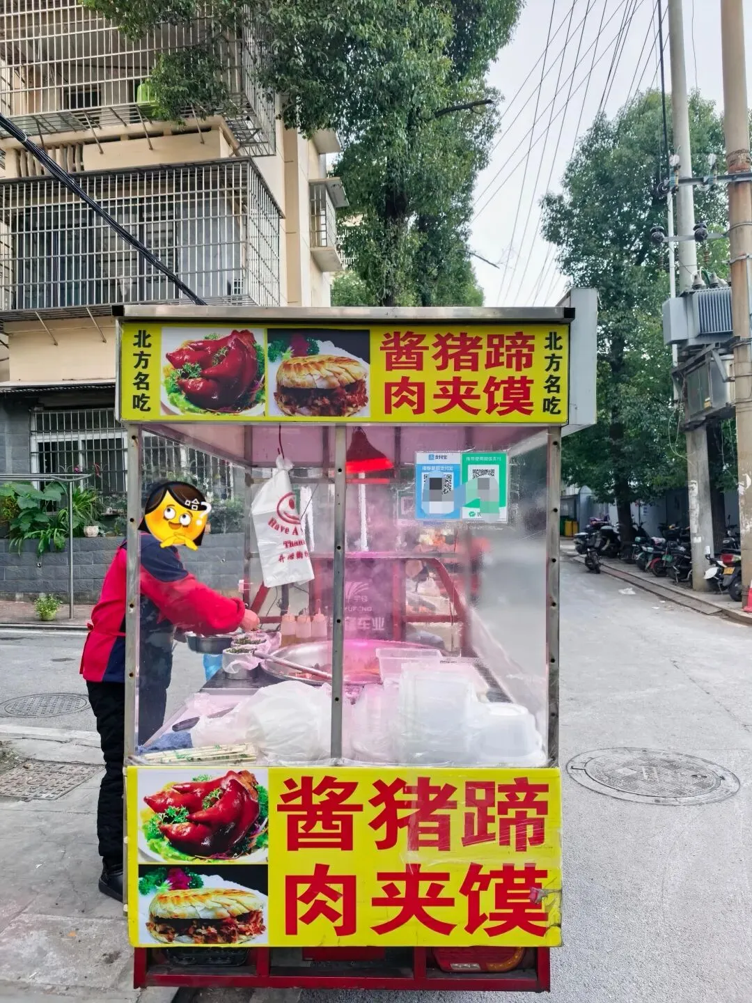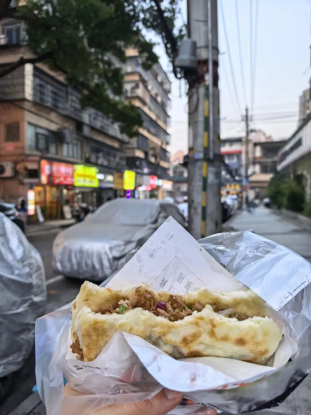 这叫不由得想起在正圆厂那边吃路边摊肉夹馍,卖相不错,份量相当扎实,因为有卤味配,选了个小肘子,那饼子烤的不焦,面粉比较软,卤汁直接把饼子一下子就浸泡软烂的感觉,加之生洋葱、青椒,总之就是,吃到后面生冷腻味,夏天可能好点,吃不下去。