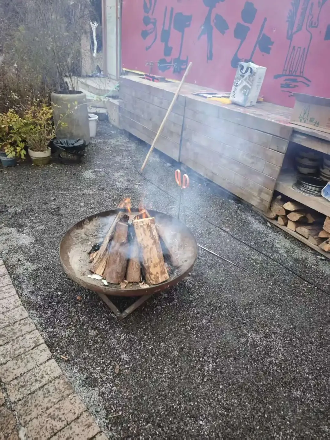 火盆刚好点上,一股农家烟火气息,算是土洋结合吧。