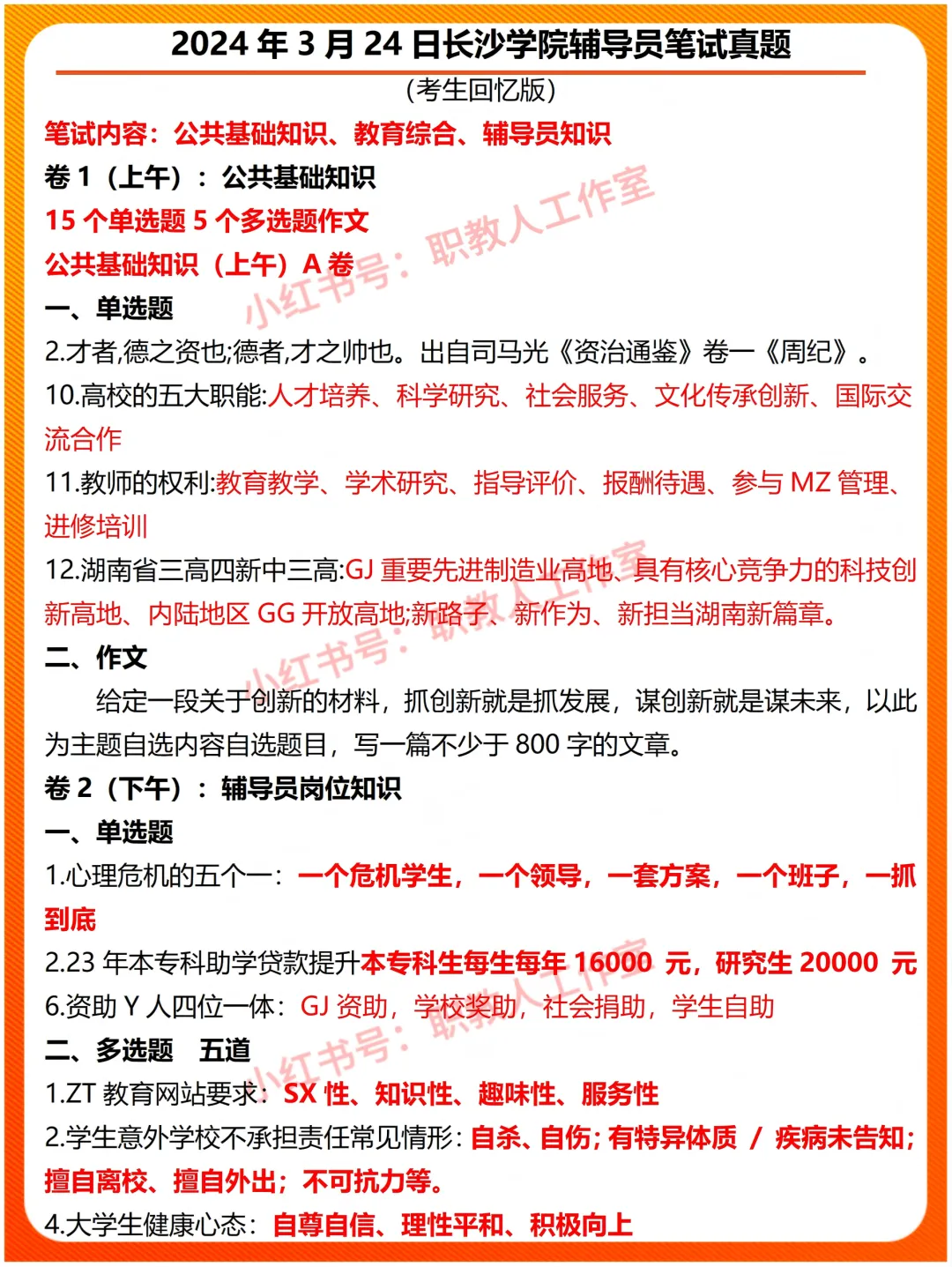 >2024年3月24日长沙学院辅导员招聘笔试真题