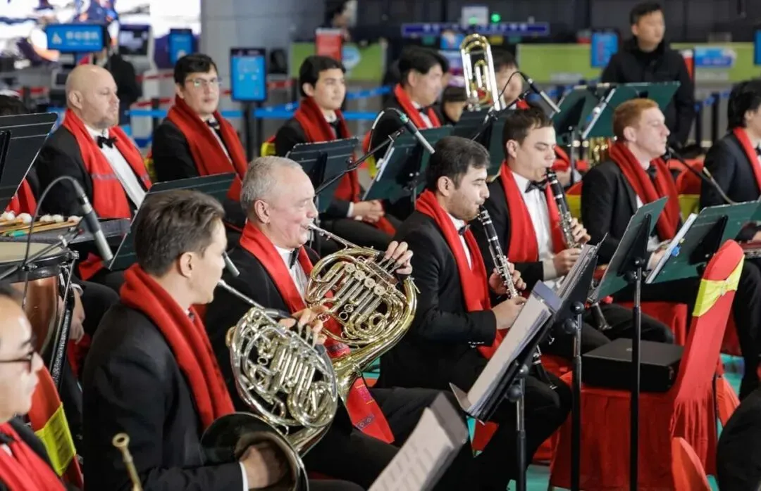 演出中,乐团以精湛技艺演绎多首经典曲目:《春节序曲》的热烈旋律瞬间点燃现场团圆喜庆氛围;《浏阳河》的婉转曲调浸润湖湘人文风情;湖南桑植民歌《四季花儿开》尽显湖湘民俗特色,《法兰多尔舞曲》、《轻骑兵序曲》等世界名曲传递多元国际韵味,丰富的曲目矩阵满足了不同旅客的审美需求。最后《我爱你中国》压轴登场,深情演绎引爆全场家国情怀,不少旅客自发跟随旋律轻声哼唱,掌声与乐声交织回荡,成为空港新春最动人的交响。