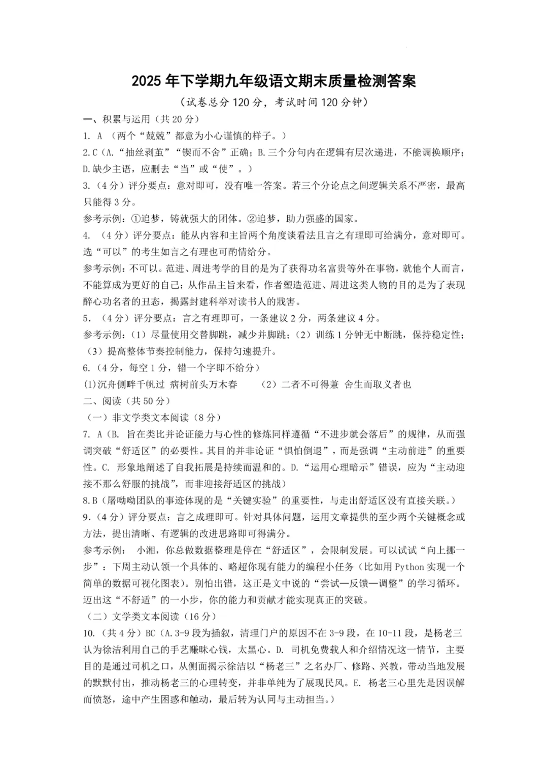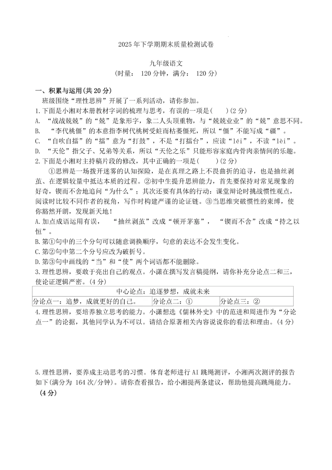 本卷以‘理性思辨’统整知识考查与能力迁移,现代文阅读选文新颖且思辨性强,古诗文群文阅读设计巧妙。得分点在于基础题紧扣教材,难点在于非连续性文本与文学文本的深度整合题,需学生具备较高的信息提炼与批判性思维能力。