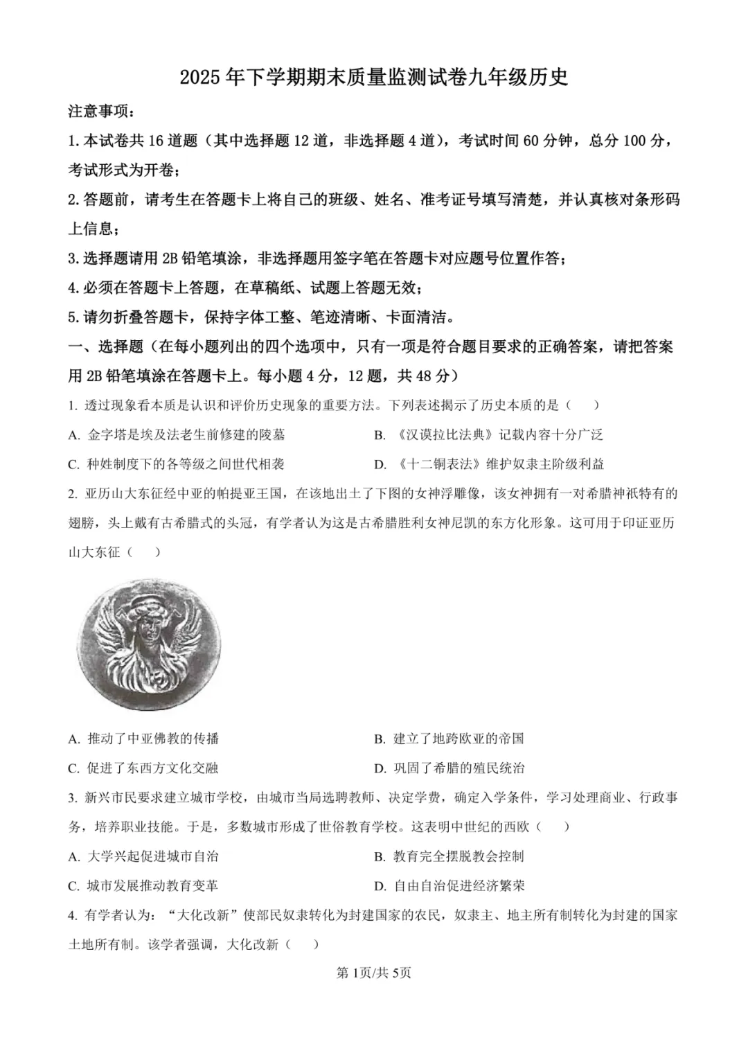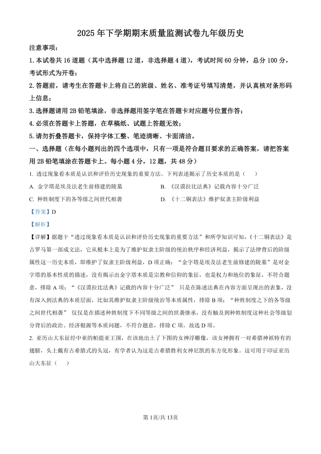 本卷以革命与变革、民主法治、科技战争等大概念统领知识体系,第13题观点论证与第16题历史分期题凸显史学素养。得分点在于选择题选项区分明确,难点在于材料解析题需跨时期整合知识(如民主法治演进)并完成200字规范表述,对史料解读与逻辑组织要求较高。