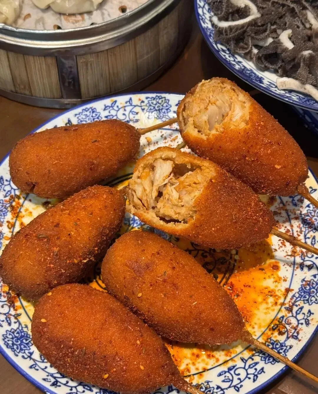 说实话我之前一直觉得 , 这玩意儿不就是个鸡肉棒嘛 , 能好吃到哪去 , 结果一口下去真的愣住了。 外面那层壳 , 炸得酥酥脆脆的 , 咬开之后里面的鸡肉是嫩的 , 不是那种柴巴巴的口感 , 是真的有肉汁的那种嫩。