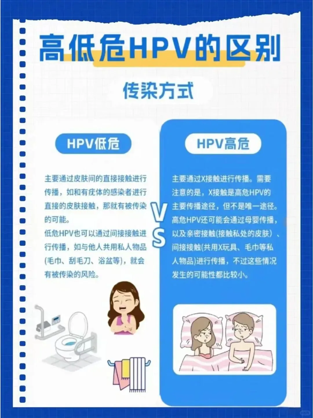 高危 HPV 则以性接触为主要传播途径(但不是唯一!母婴传播、密切接触私处皮肤、共用性玩具/毛巾等也会“中招”,只是概率更低)。在长沙新湘医院 HPV 防治中心门诊,医生常遇到患者慌问:“和家人共用马桶会传高危 HPV 吗?”其实高危型通过间接接触传播概率小,但咱也不能掉以轻心——医院会结合你的生活习惯、接触史,帮你排查感染风险点~2. 致病表现:症状风险大不同