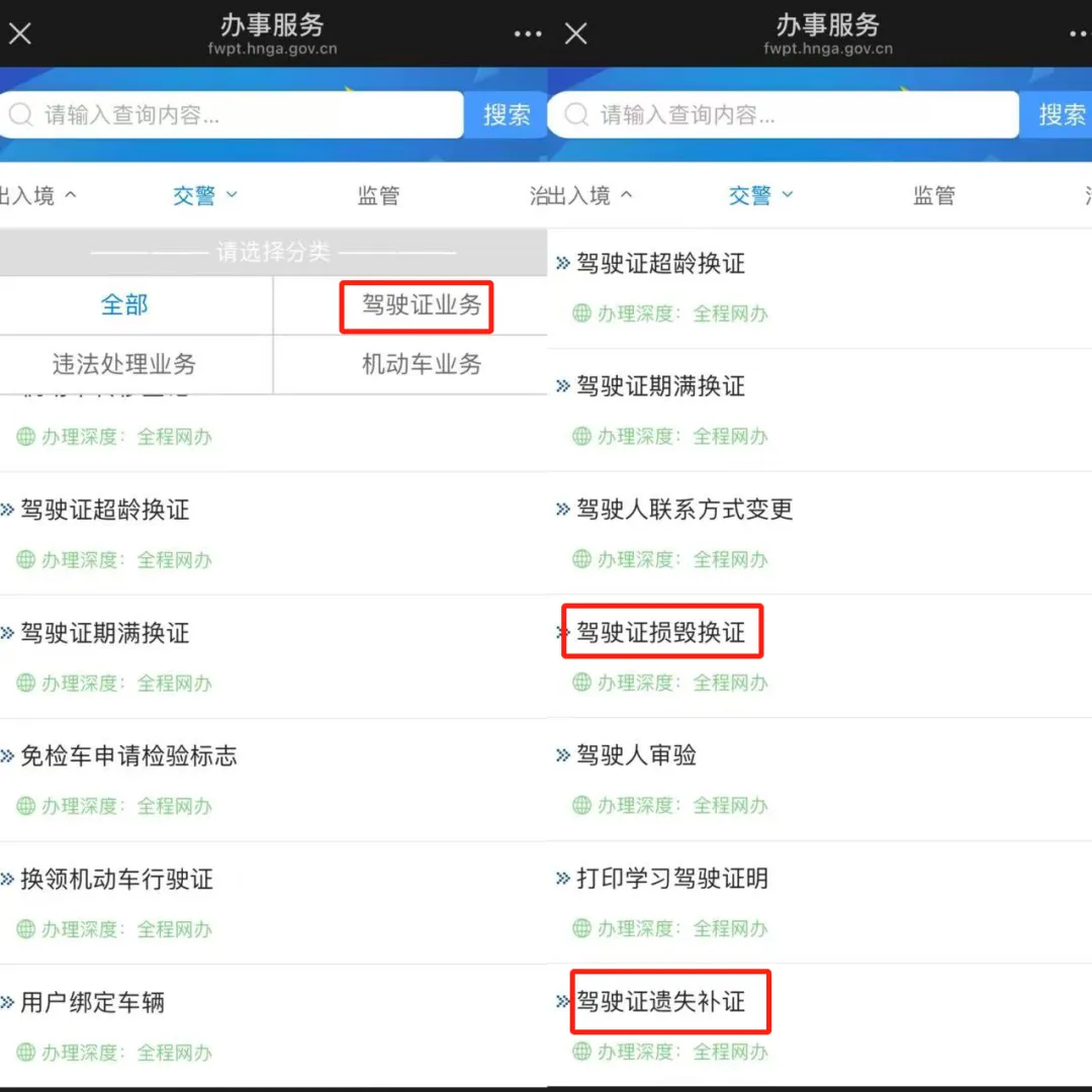 ❷点击“驾驶证业务”,选择“驾驶证损毁换证”或“驾驶证遗失补证”。