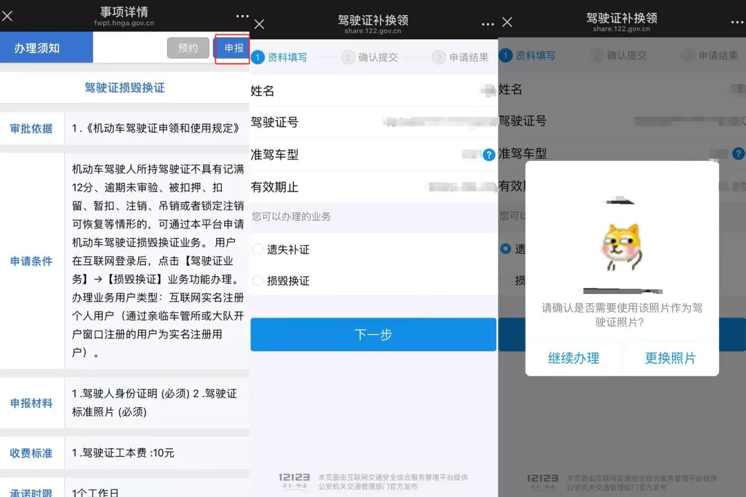 ❸点击右上角“申报”按钮,选择要办理的业务类型,点击下一步,根据个人需求选择是否更换照片。