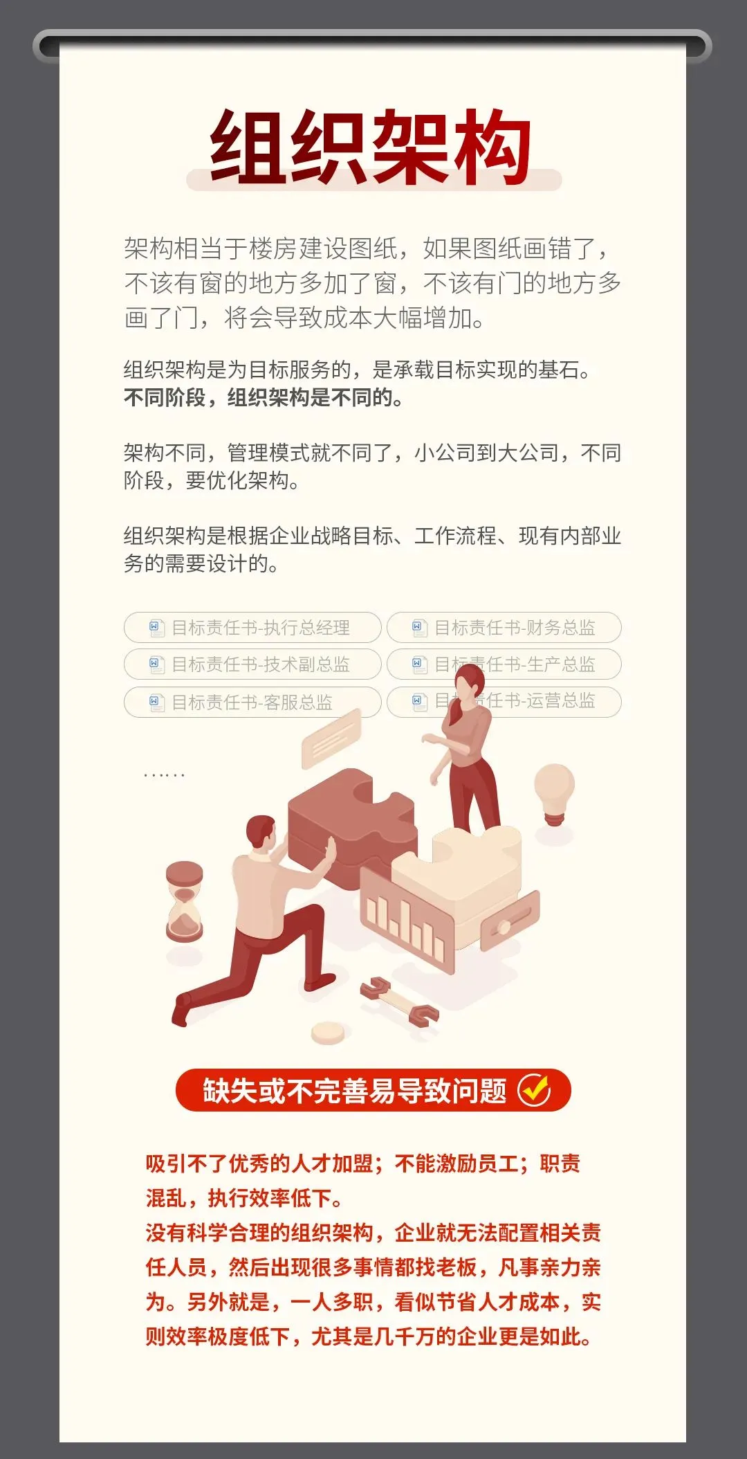不仅要建立一套完善的工作分析体系,还要建立绩效考核制度,对员工胜任力进行评价和量化,还要将薪酬设计以及晋升考核与结果挂钩,也就是薪、晋、考、三维一体。公司管理靠人来管人非常难,用机制来驱动人,激活人,各司其职管理将变得高效有结果!