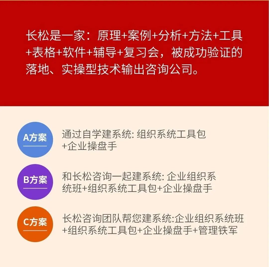 面对上述问题,作为一个企业家无时无刻不在寻找解决办法,可是效果不理想,有人觉得薪酬、绩效很难,市面上有太多管理咨询公司,到底该选择哪一家?长松咨询的组织系统在竞争如此激烈的今天,仍然独占鳌头,到底有什么过人之处?欢迎来公司了解或者到咨询会、总裁班现场体验!