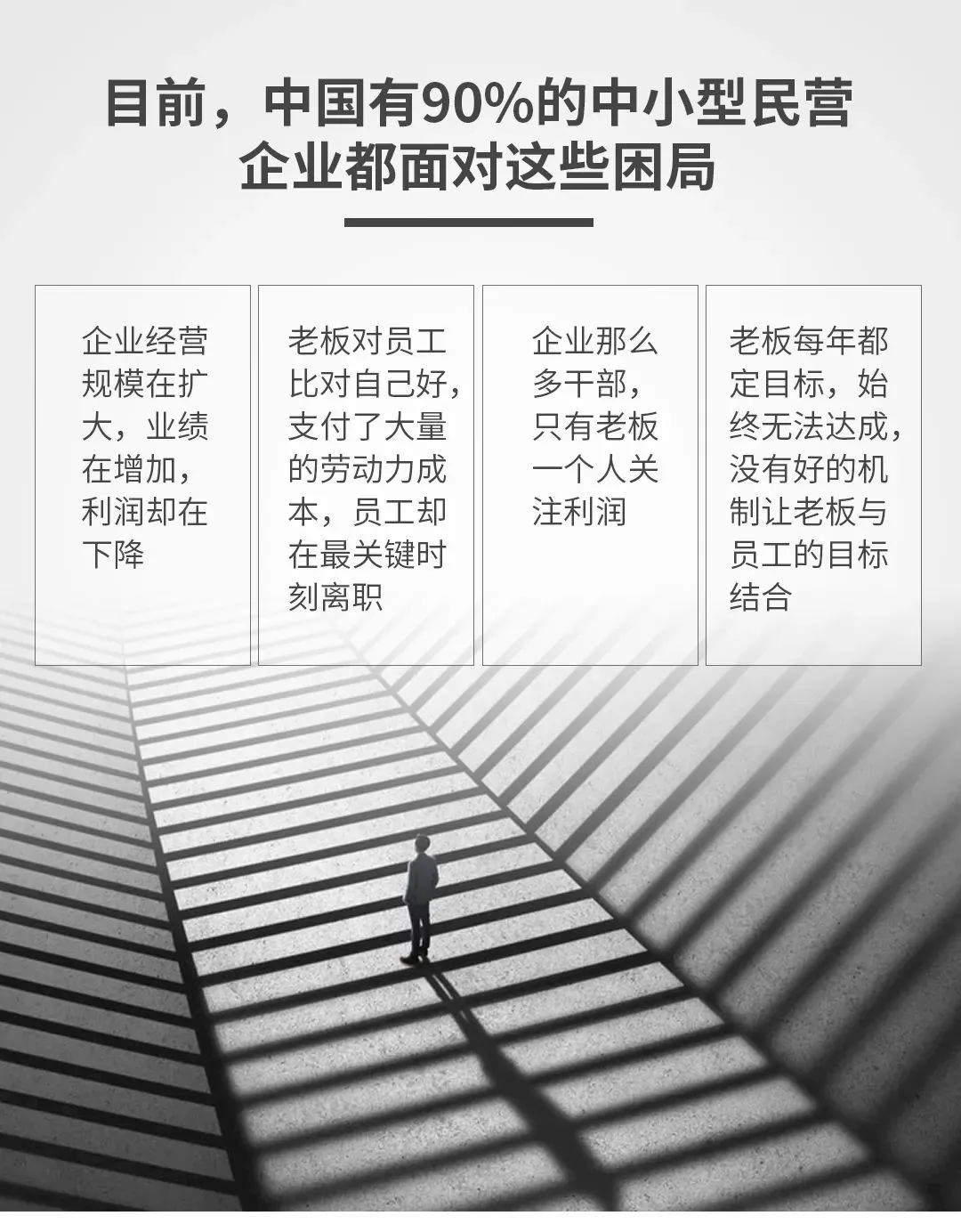 建立一支有战斗力的企业团队,老板不能凭一己之力!更要学会依靠团队、依靠系统的力量!将成型的业务流程教给员工、将成体系的管理制度导入团队、用操盘的思维去经营企业!把自己从企业中解放出来,老板才能站在更高的层次去与市场博弈!