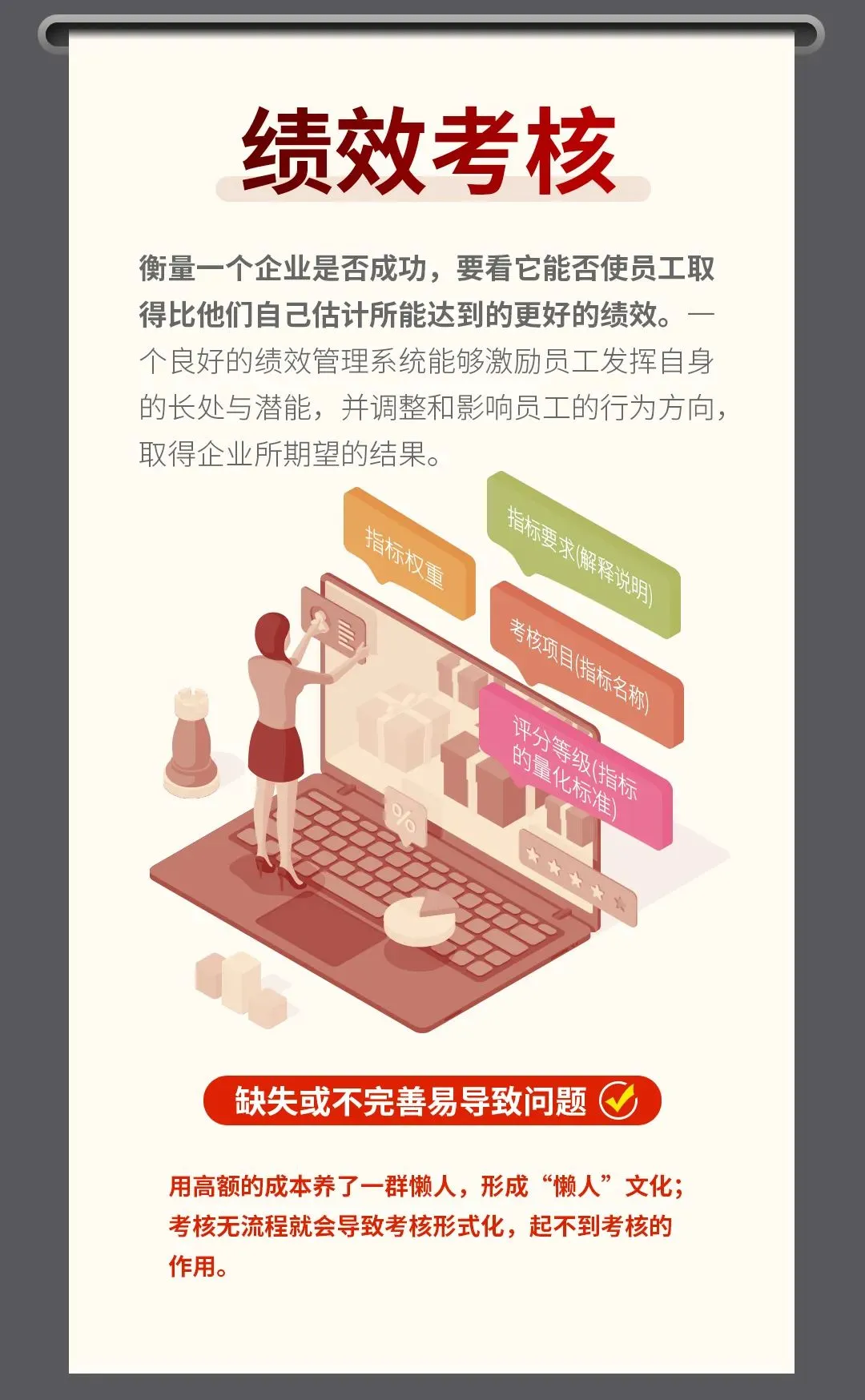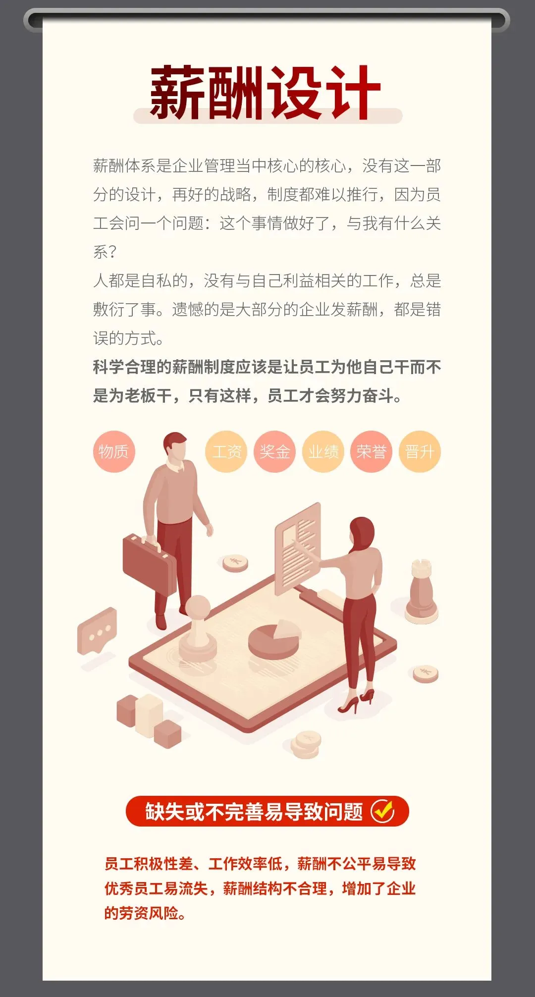 不仅要建立一套完善的工作分析体系,还要建立绩效考核制度,对员工胜任力进行评价和量化,还要将薪酬设计以及晋升考核与结果挂钩,也就是薪、晋、考、三维一体。公司管理靠人来管人非常难,用机制来驱动人,激活人,各司其职管理将变得高效有结果!