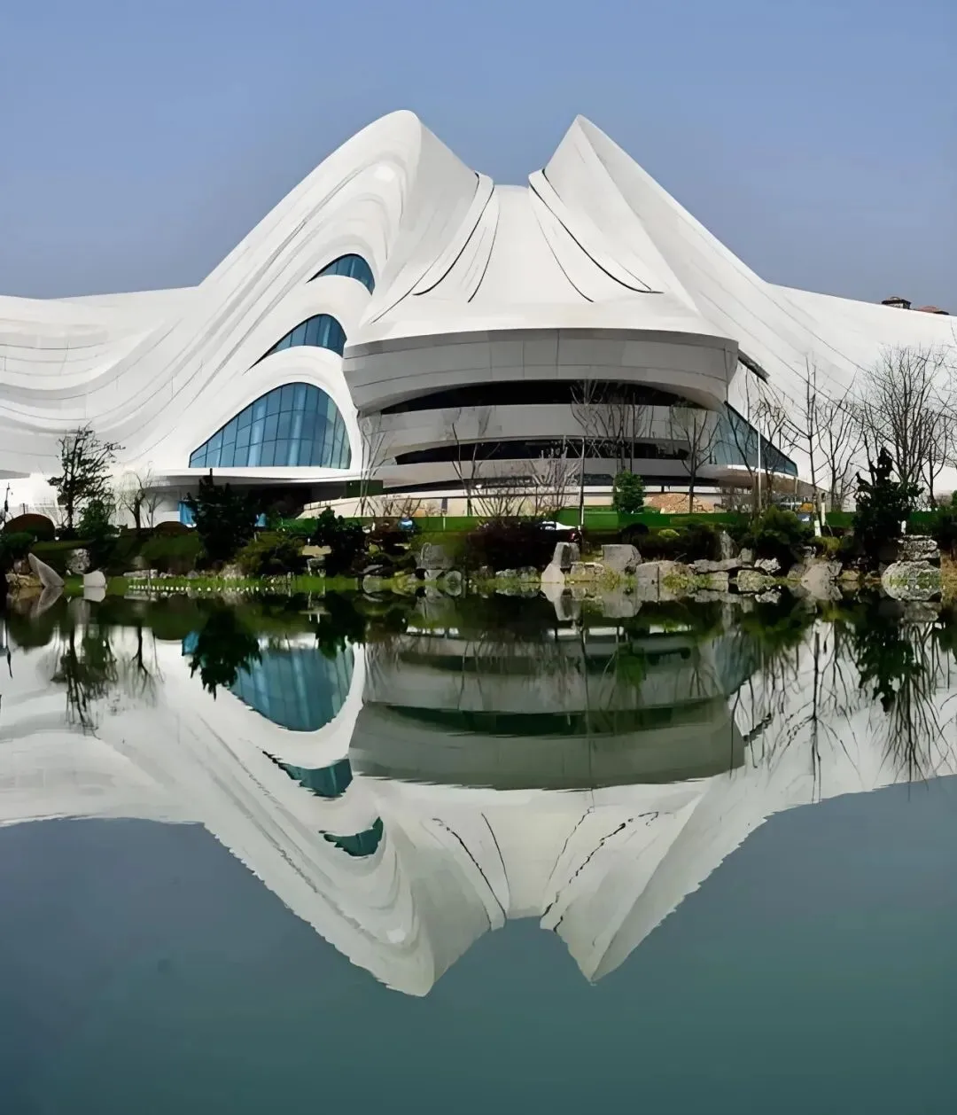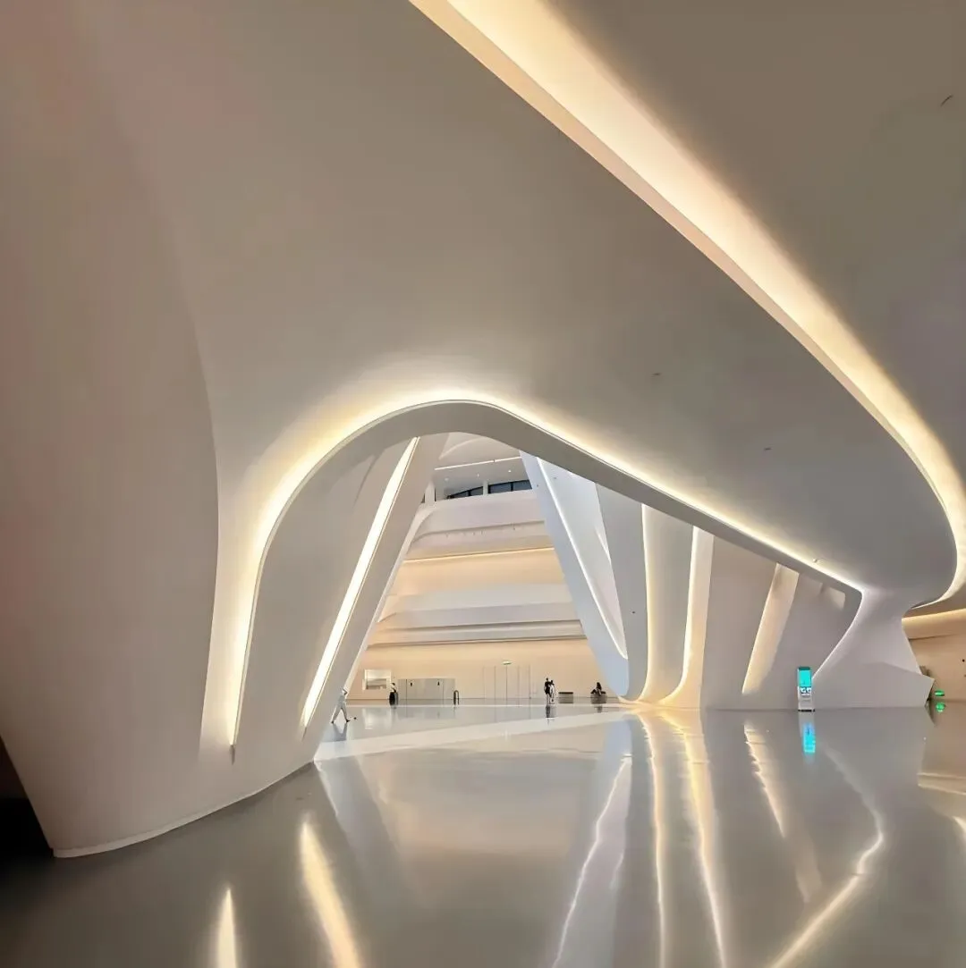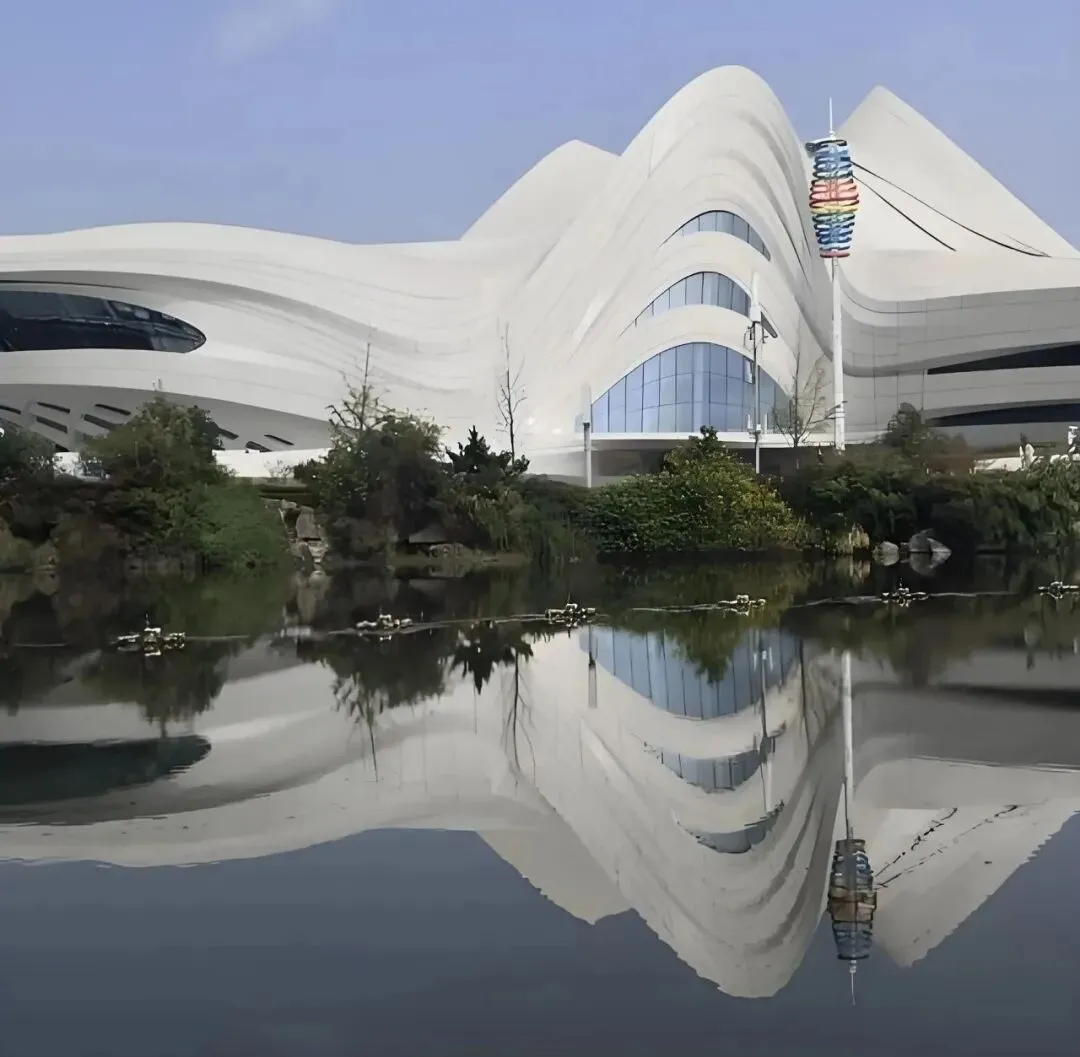设计理念的革新,是建筑的灵魂内核。扎哈以“芙蓉花开”为核心意象,摒弃传统文化建筑的对称刻板,用连续舒展的流线型体量,模拟芙蓉花瓣舒展绽放的姿态,让建筑仿佛从梅溪湖畔自然生长而出,与湖水、天光构成一幅灵动的生态画卷。三大主体场馆——大剧院、多功能小剧场与艺术馆,如花瓣相拥,既各自独立又有机共生,完美诠释了她“流动即永恒”的设计信条。其设计不仅呼应了“芙蓉国”的湖南别称,更以开放的形态打破艺术与大众的边界,让建筑成为连接自然、城市与艺术的媒介。